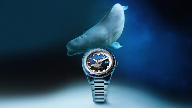 ベルーガモデルは、彼らが生息する北極圏の冷たい海を思わせるブルーのダイヤルを採用。親子なのか兄弟なのか、仲睦まじく泳ぐ2頭のベルーガを表現しました。日付表示にライトブルーを用いたのも特徴です。