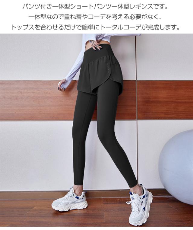 ショートパンツ一体型レギンスです。一体型なので重ね着やコーデを考える必要がなく、トップスを合わせるだけで簡単にトータルコーデが完成します。