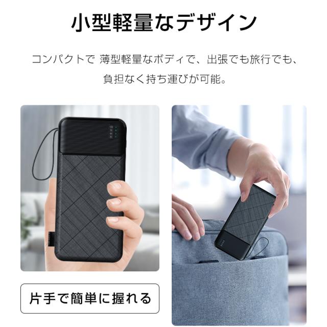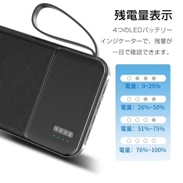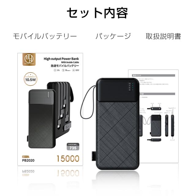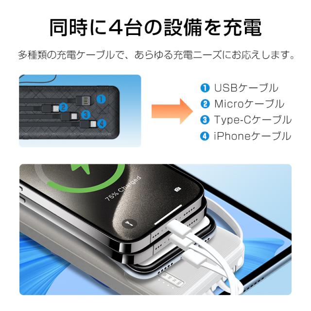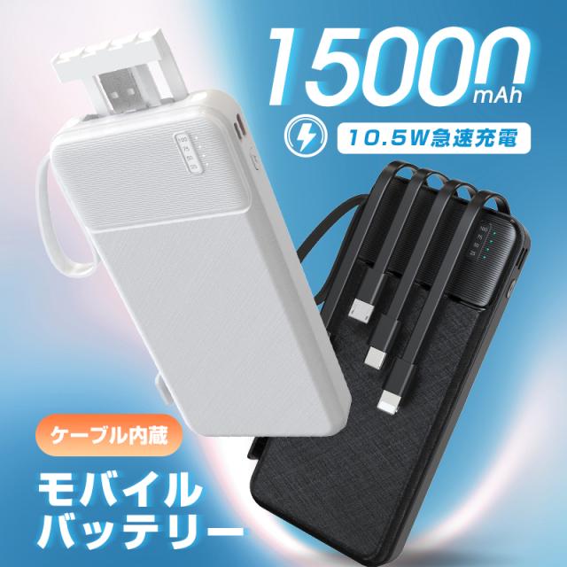 【期間限定1,299円】モバイルバッテリー 15000mAh 55.5Wh 大容量 LED ライト付き 緊急照明 4本ケーブル内蔵 iPhone17/iPhoneAir充電 Type-Cケーブル付き 急速充電 iOS/iPad/Android各機種対応 小型 軽量 ストラップ付き 防災グッズ PSE認証済【PL保険加入済み製品・安心】