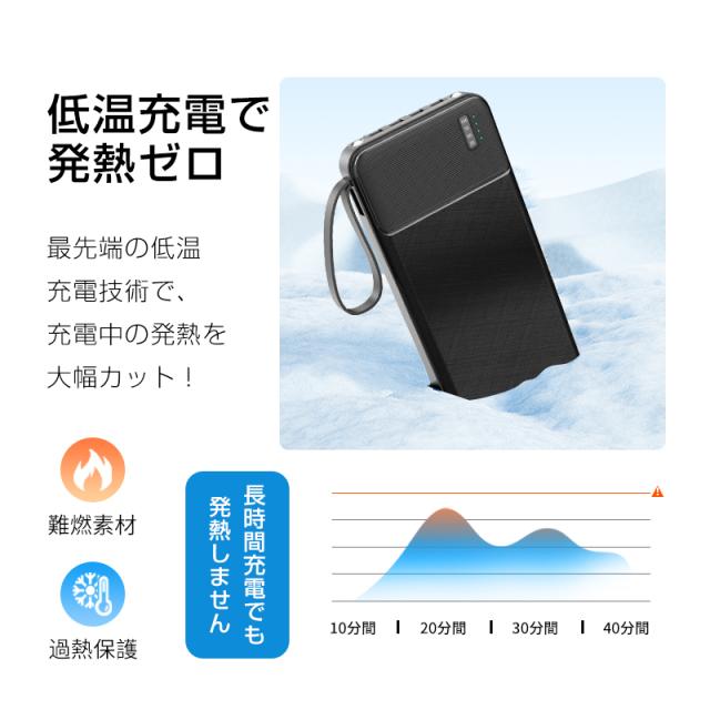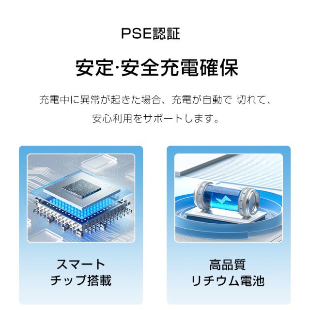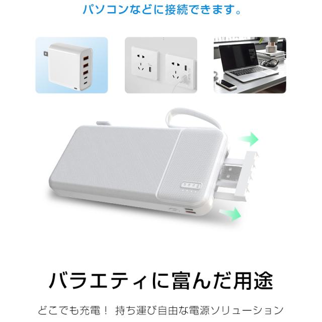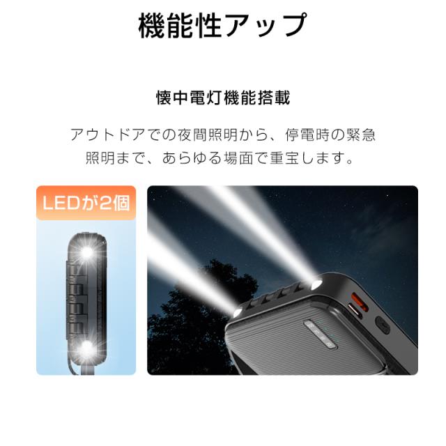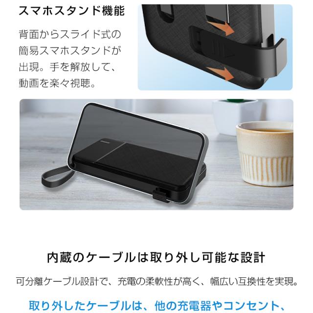 充電機能では複数の出力ケーブルとUSB-A出力ポートを装備し、4台のデバイスを同時に充電可能です。内蔵LEDライトは、暗所での作業や非常時の照明として活用できます。また、内蔵のケーブルは、着脱式で、抜き取って、他のデバイスと組み合わせて使用できます。更に、折りたたみ式スタンド機能により、充電中のデバイスを安定して置くことができ、動画視聴やビデオ通話にも最適です。