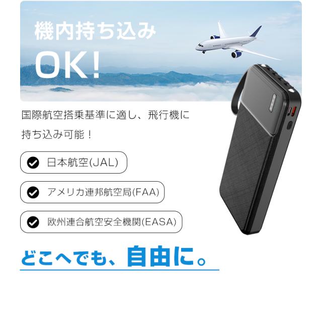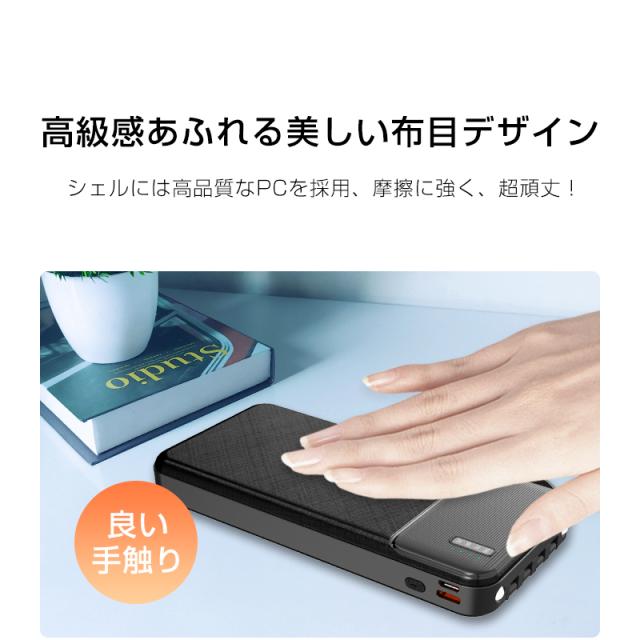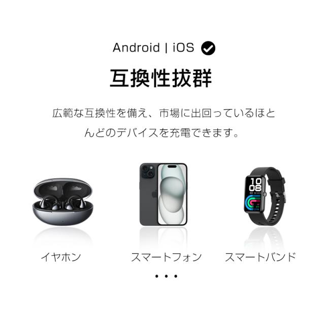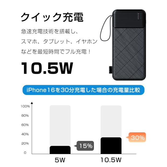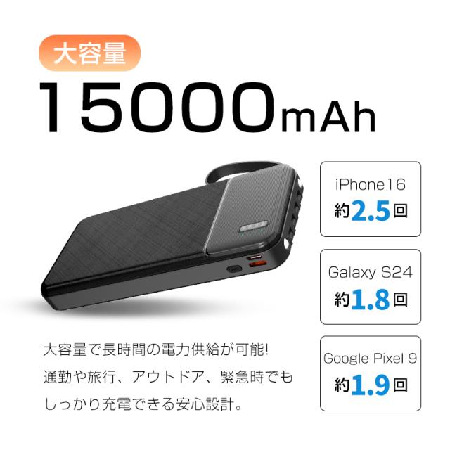 15000mAhの大容量バッテリーは、スマートフォンを約3〜4回フル充電可能です。最新のPower Delivery技術に対応した10.5W急速充電により、短時間で効率的な充電が行えます。自身の充電はUSB-Cポートで約4時間で完了し、待ち時間を最小限に抑えます。