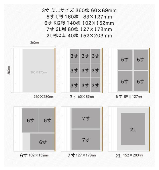 | 大切な思い出をしっかり残せる大容量タイプのフォトアルバム。 ミニサイズ・L判・KG判・2L判・2L判以上など様々なサイズの写真に対応し、フリー台紙だから自由にレイアウトできます。 3寸 ミニサイズ 360枚 60×89mm 5寸 L判 160枚 89×127mm 6寸 KG判 140枚 102×152mm 7寸 2L判 80枚 127×178mm 2L判以上 40枚 152×203mm 写真の貼り直しが可能〜繰り返し使用OK!切手、メディアやパンフなどが整理できる多機能フィルム。 表紙のフレーム部分にお気に入りの写真を入れて、お部屋のインテリアとして棚に飾るのもオススメ。 子供の成長記録や赤ちゃんの記念日、旅行写真、結婚式や卒業・入学の思い出まで幅広く活用できます。 | |