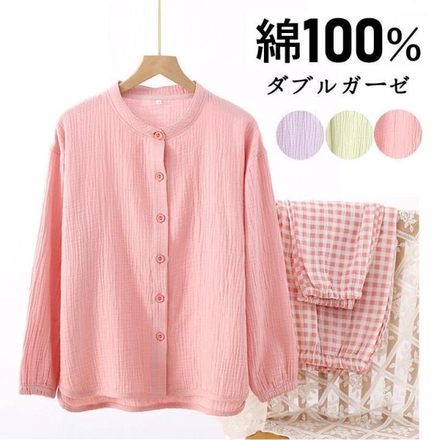 ルームウェア パジャマ レディース 二重ガーゼ 綿100% 前開き 長袖 半袖 長ズボン 春 夏 秋 ダブルガーゼ ガーゼパジャマ シニア 冷え性対策