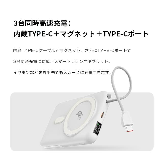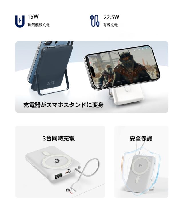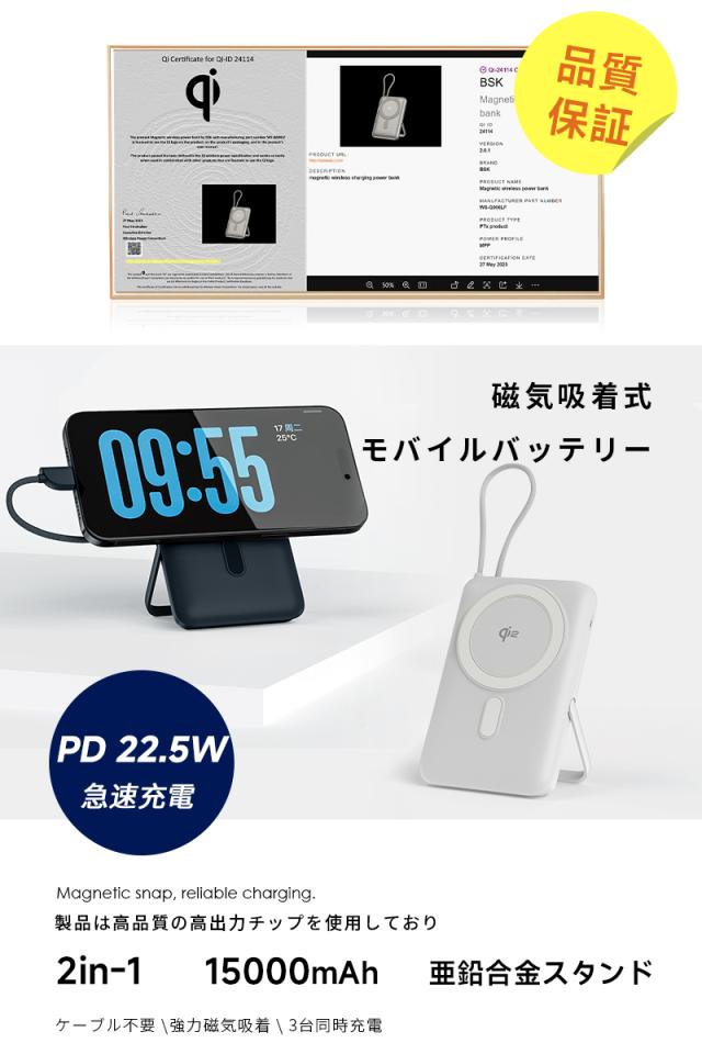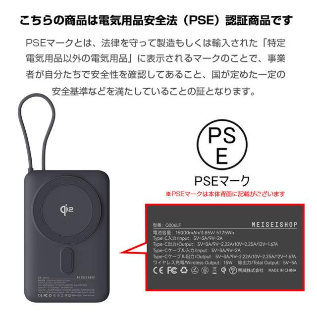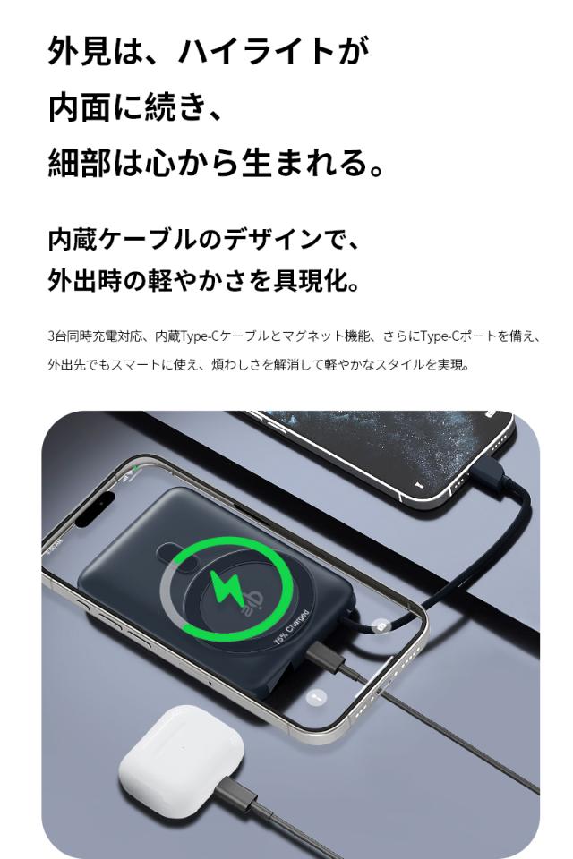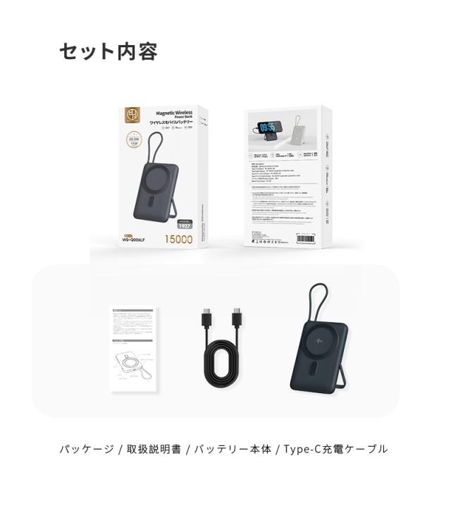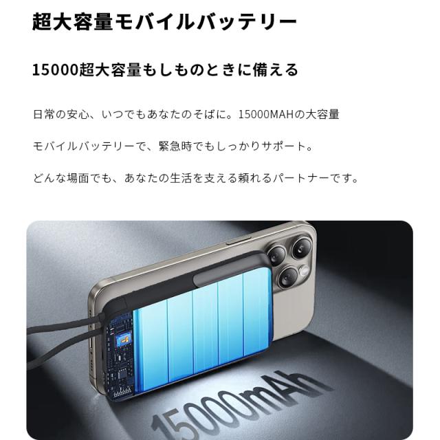 モバイルバッテリー 15000mAh 57.75Wh 大容量 ワイヤレス充電器 MagSafe対応 15W磁気充電 3台同時充電 Qi認証済 iPhone17/iPhoneAir充電 iphone16/15/Airpods PD22.5W急速充電 防災電源 ケーブル内蔵 互換性抜群 コンパクト 軽量 PSE認証済【PL保険加入済み製品・安心】