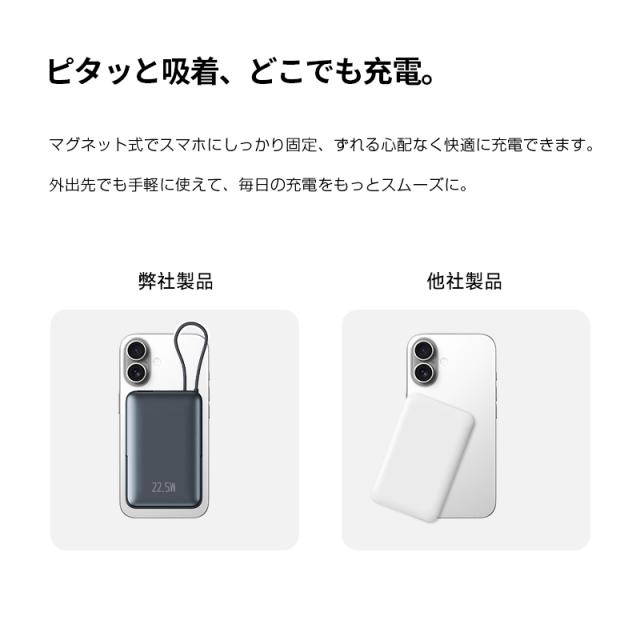 本製品はMagsafe技術を応用して、磁力の強い磁石を内蔵し、iPhone17/16/15/14/13 /12シリーズを近づくだけで背面に吸着され、直接充電することができます。