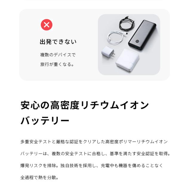 - ワイヤレス充電も急速充電もできるので購入しました。 5000mAの機器2回分も充電ができなかったので、交換対応しましたが、2回分は厳しいかなと言う結論でした。値段を考えたら仕方ない面も。しっかりした補償を受けられるお店の対応は優良です。