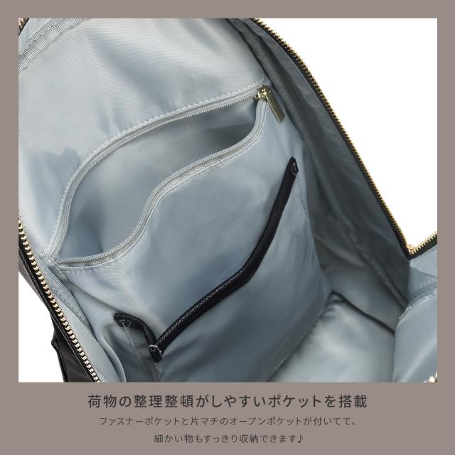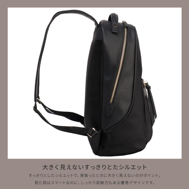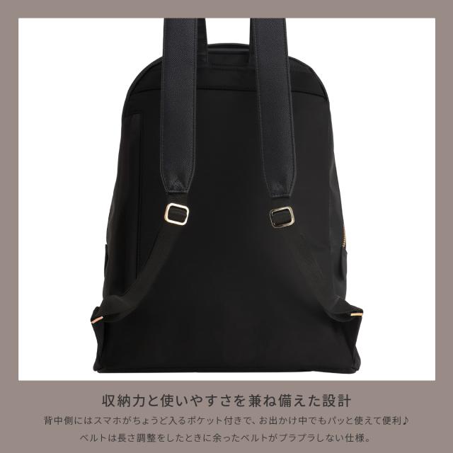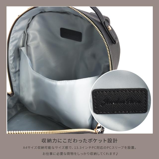 | 上品で高級感のあるお仕事リュック ・ナイロン×フェイクレザーの上品なデザイン ・背負った時に大きく見えないすっきりとたシルエット ・A4/13.3インチPC収納可能なサイズ感 ツヤ感のあるナイロン素材に、表情のあるフェイクレザーを掛け合わせた 上品で高級感のあるリュックサック。 フロントのロゴやファスナーでポイント使いしたゴールドのカラーリングで華やかな印象に。 A4クリアファイル(W22×H31cm)収納可能なサイズ感で、 13.3インチPC(W31×H22×D2.5cm)対応のPCスリーブを設置。 お仕事に必要な荷物をしっかり収納してくれます。 すっきりとしたシルエットなので背負った時に大きく見えないのがポイント。 背負ったままアクセスできる背面ポケットは スマートフォンや社員証、定期などサッと取り出したい物の収納におすすめです。 内装カラー ・本体:ブラック×内装:ブルー ・本体:グレージュ×内装:ベージュ ・本体:ダークブラウン×内装:ブラウン 【内装ポケット】 ・13.3インチ対応PCスリーブ×1 ・ファスナーポケット×1 ・片マチオープンポケット×1 【外装ポケット】 ・フロントポケット×1 ・背面ポケット×1 |