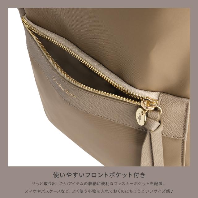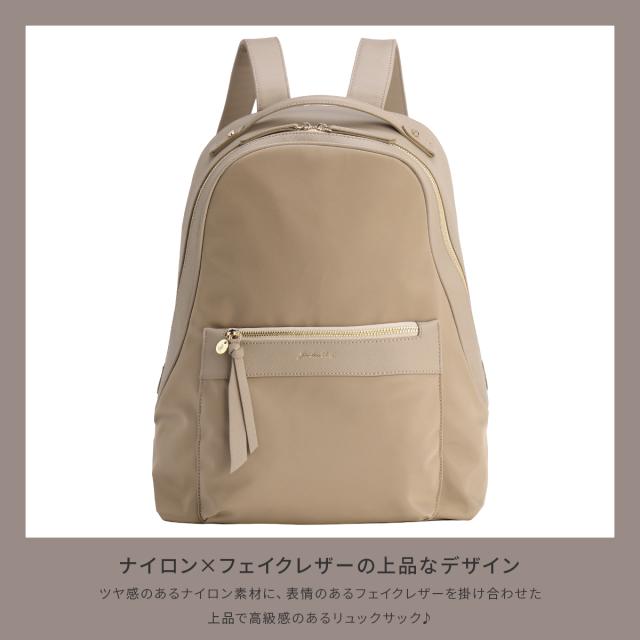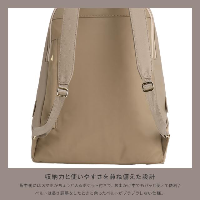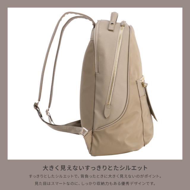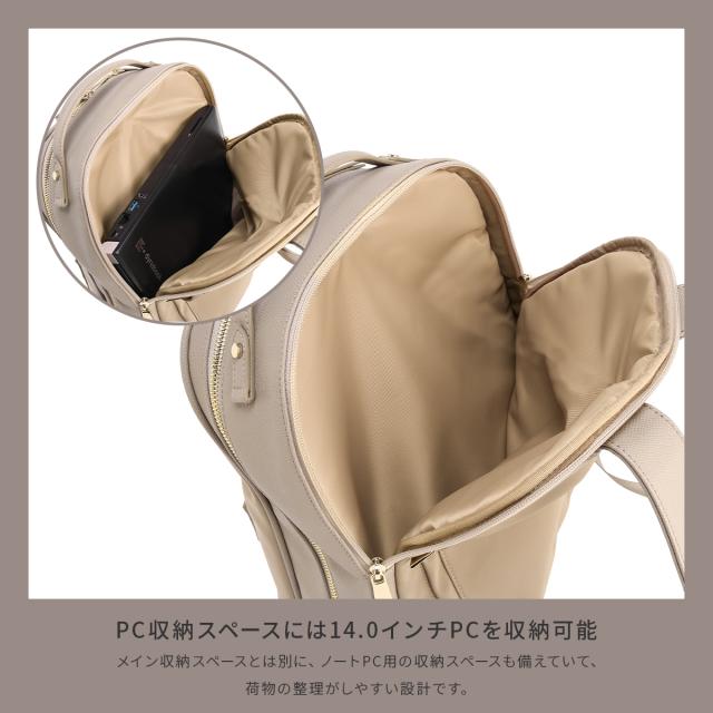 | 上品で高級感のあるお仕事リュック ・ナイロン×フェイクレザーの上品なデザイン ・背負った時に大きく見えないすっきりとたシルエット ・A4/14.0インチPC収納可能なサイズ感 ツヤ感のあるナイロン素材に、表情のあるフェイクレザーを掛け合わせた 上品で高級感のあるリュックサック。 フロントのロゴやファスナーでポイント使いしたゴールドのカラーリングで華やかな印象に。 A4クリアファイル(W22×H31cm)収納可能なサイズ感。 メイン収納スペースとPC収納スペースの2ルーム設計で、 PC収納スペースには14.0インチPCを収納できます。 すっきりとしたシルエットなので背負った時に大きく見えないのがポイント。 背負ったままアクセスできる背面ポケットは スマートフォンや社員証、定期などサッと取り出したい物の収納におすすめです。 内装カラー ・本体:ブラック×内装:ブルー ・本体:グレージュ×内装:ベージュ ・本体:ダークブラウン×内装:ブラウン 【内装ポケット】 ・A4サイズポケット×1 ・ファスナーポケット×1 ・オープンポケット×2 ・片マチオープンポケット×1 【外装ポケット】 ・フロントポケット×1 ・背面ポケット×1 |
