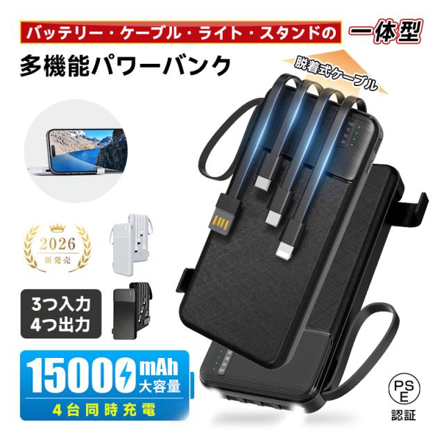 【期間限定・1,299円】 モバイルバッテリー 15000mAh 55.5Wh 大容量 ライト付き 着脱式ケーブル 4台同時充電 引き出し式 スタンド付き パワーバンク USB-A出力 Type-Cケーブル付き iOS/Android 小型 軽量 旅行 出張 iPhone17/iPhoneAir対応 【PL保険加入済み製品・安心】