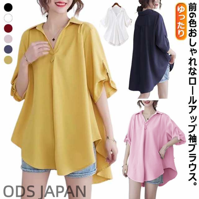 ブラウス レディース スキッパーシャツ 春 夏 ロールアップ スキッパー ブラウスシャツ トップス ゆったり 半袖 チュニック 無地 きれいめ 上品 大人 オフィス カジュアル シャツ 春夏 20代 30代 40代 ママ 母