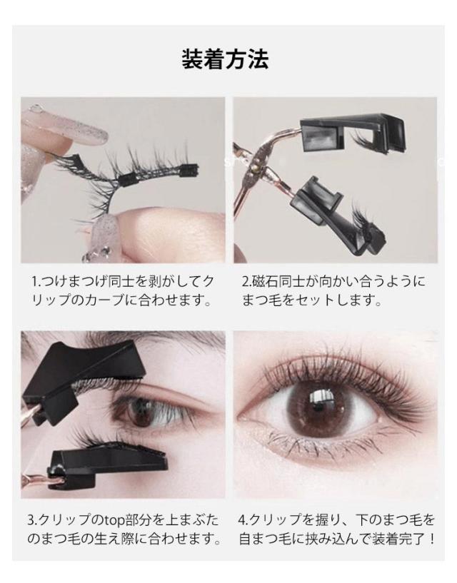 | 2点セット!4タイプ!磁気まつげを自まつげのに置くだけで瞬時にくっつき、面倒な接着剤や接着剤は必要ありません。 磁石技術を採用し、高級人工繊維を使用し、接着剤なしで簡単にマグネットつけまつげを取り付けることができます。 わずか2秒で美しく自然なまつげを実現できます。 まつげのボリュームアップさせながら、肌を傷めず、より重層的で立体的な目元を演出します。 ●装着方法 1.つけまつげ同士を剥がしてクリップのカーブに合わせます。 2.磁石同士が向かい合うようにまつ毛をセットします。 3.クリップのtop部分を上まぶたのまつ毛の生え際に合わせます。 4.クリップを握り、下のまつ毛を自まつ毛に挟み込んで装着完了! | |