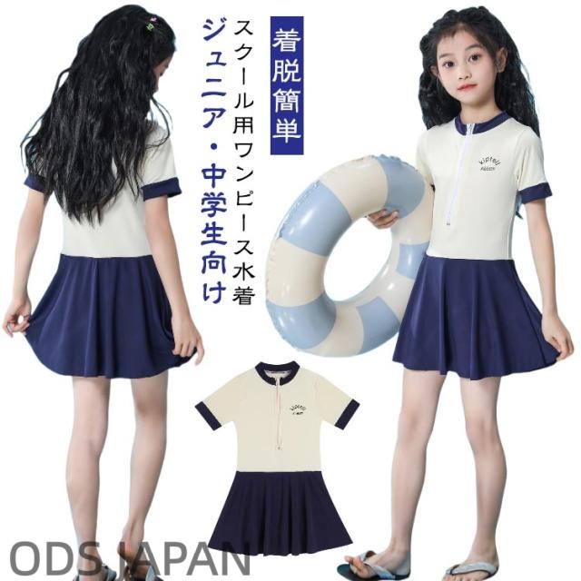 水着 女の子 キッズ 子供水着 半袖 ワンピース水着 インナーパンツ付き スイムウェア シンプル かわいい フロントジッパー 着脱簡単 スイミング スクール用 ジュニア ガールズ 女児 小学生 中学生