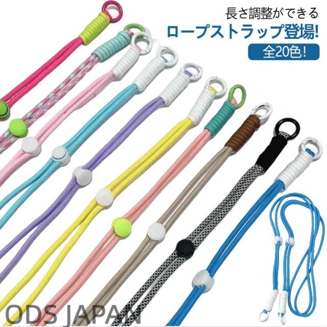 | 長さ調整ができるロープストラップ登場!! 全20色!服装に合わせやすい! 長さが調整できるので、背丈や服装に合わせて共有できる! | |