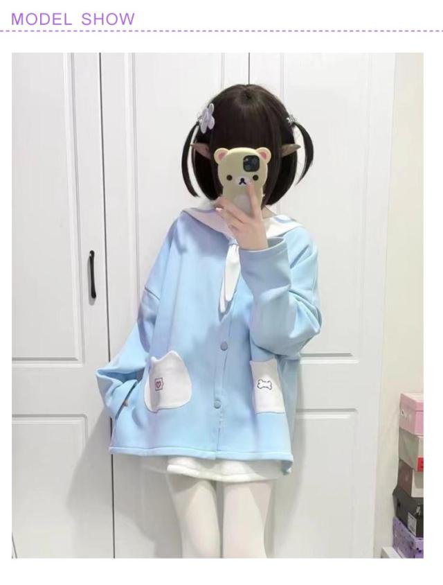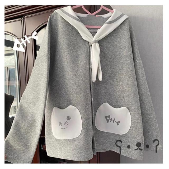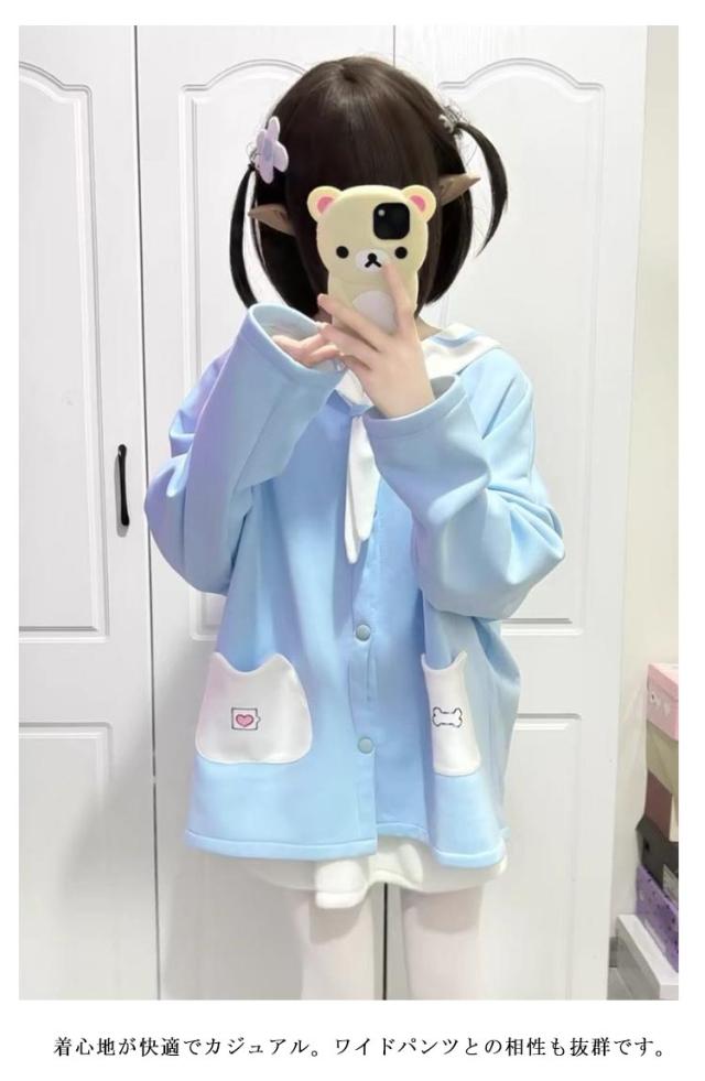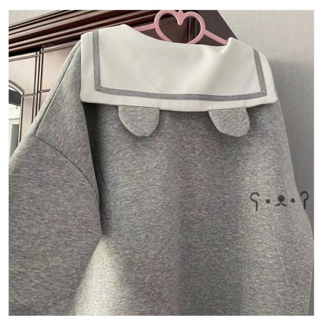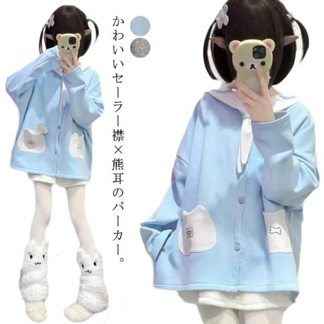 | かわいいセーラー襟×熊耳のパーカー。 着心地が快適でカジュアル。ワイドパンツとの相性も抜群です。 高校生から大人まで、愛されるデザインです。 日常のコーディネートから部屋着、パジャマまで幅広く利用可能。 | |