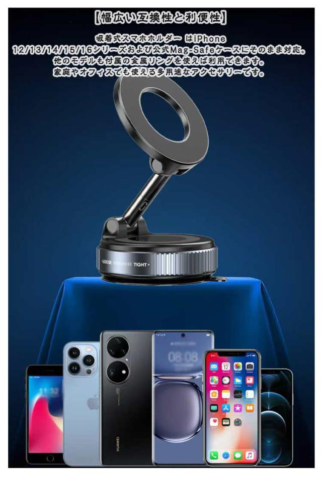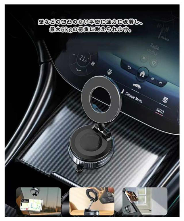 | 【手動式真空吸着で便利】スマホスタンド マグネット は最新の手動式真空吸着とMagSafeを組み合わせたスマホスタンドです。ベース部分を時計回りに回転させることで真空状態をONにし、反時計回りで解除可能。壁などの凹凸のない平面に強力に吸着し、最大5kgの荷重に耐えられます。 【強力なMagSafe固定機能】スマートフォンの固定はMag-Safeマグネットで行い、付属のメタルプレートを使用することで、非Mag-Safe対応の機種でも利用可能です。用途や設置場所に応じて、Mag-Safeマグネットによる固定と真空吸着を使い分けることができます。 【スムーズな視点調整】スマホホルダー 真空吸着 は360°の角度に自由回転させることが可能で、スマホの角度も自由に調整できます。オフィスや家庭内、車内空間、旅行先などでも活躍するコンパクトで携帯に便利なデザインです。 【精密設計・高耐久亜鉛合金素材】スマートフォンをしっかりと支える機械式レバーと高強度の合金アームを搭載しており、落下を防止します。亜鉛合金製のアーム軸など、耐久性に優れた素材を用いた精密設計で、長期間にわたり使用可能な品質を誇ります。 【幅広い互換性と利便性】吸着式スマホホルダー はiPhone 12/13/14/15/16シリーズおよび公式Mag-Safeケースにそのまま対応。他のモデルも付属の金属リングを使えば利用できます。家庭やオフィスでも使える多用途なアクセサリーです。 | |