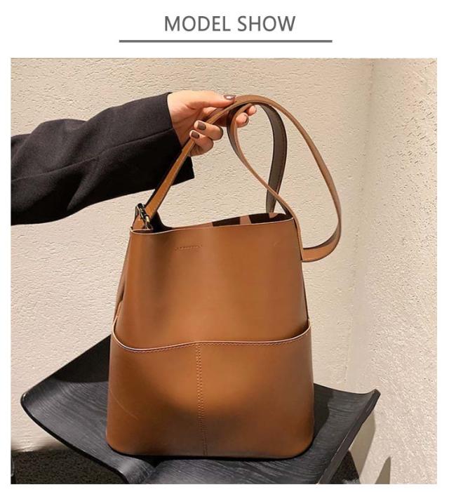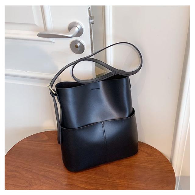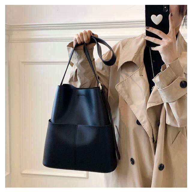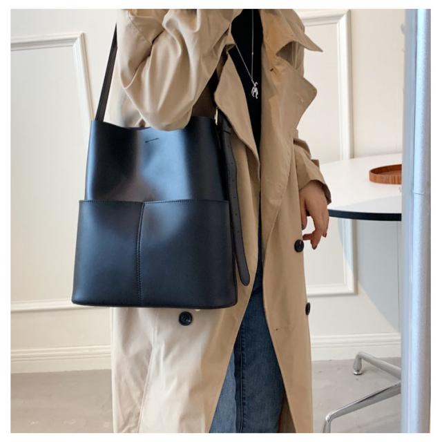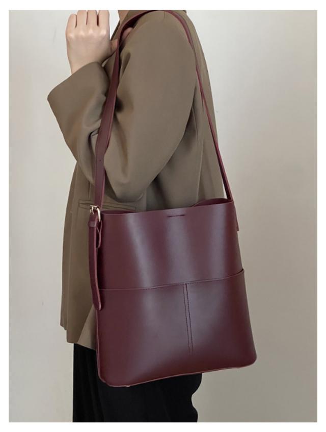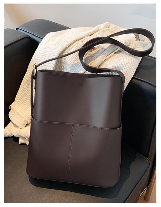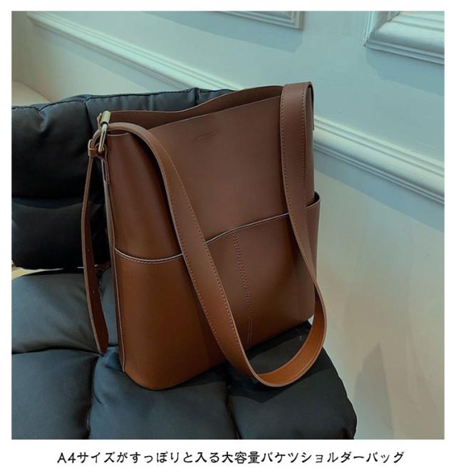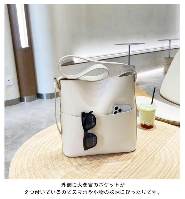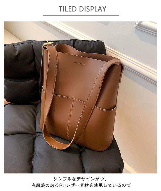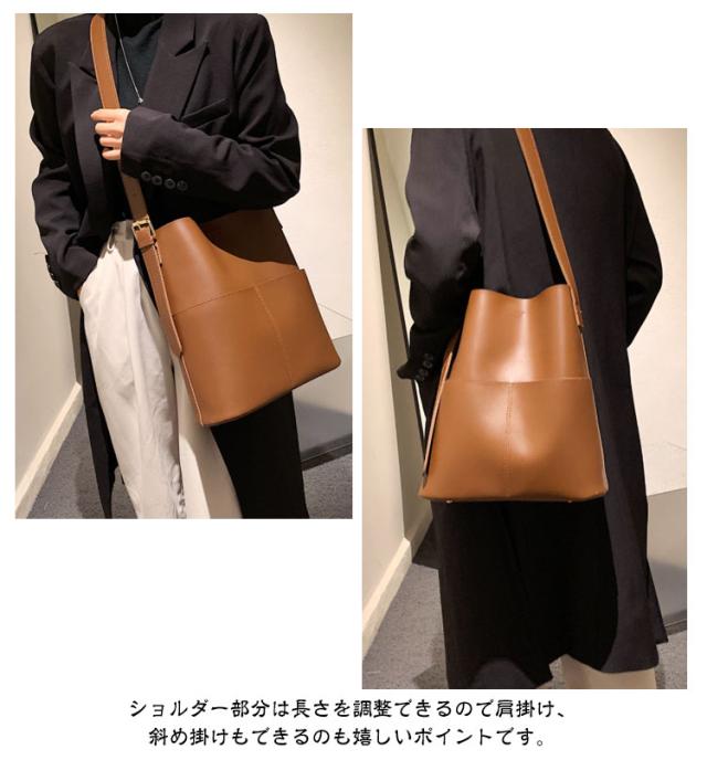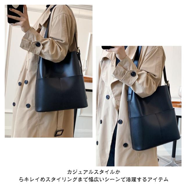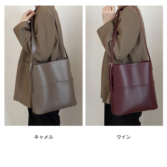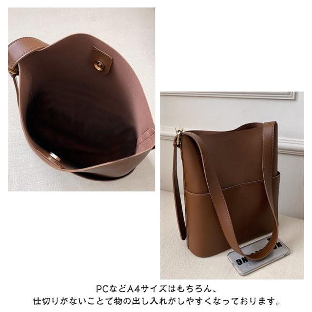 | A4サイズがすっぽりと入る大容量バケツショルダーバッグ ◎PCなどA4サイズはもちろん、仕切りがないことで物の出し入れがしやすくなっております。 ◎外側に大き目のポケットが2つ付いているのでスマホや小物の収納にぴったりです。 ◎ショルダー部分は長さを調整できるので肩掛け、斜め掛けもできるのも嬉しいポイントです。 ◎シンプルなデザインかつ、高級感のあるPUレザー素材を使用しているので ◎カジュアルスタイルからキレイめスタイリングまで幅広いシーンで活躍するアイテム | |