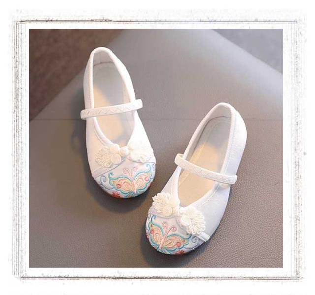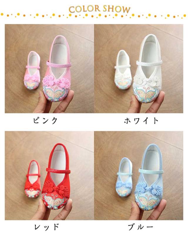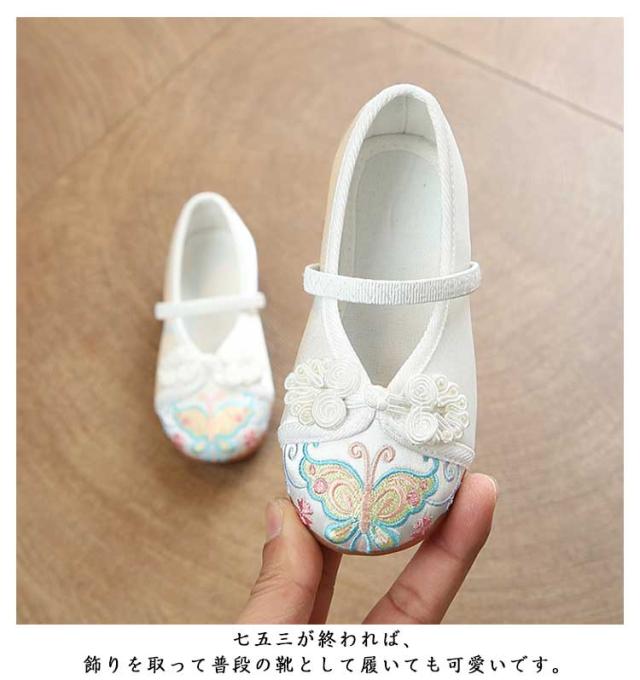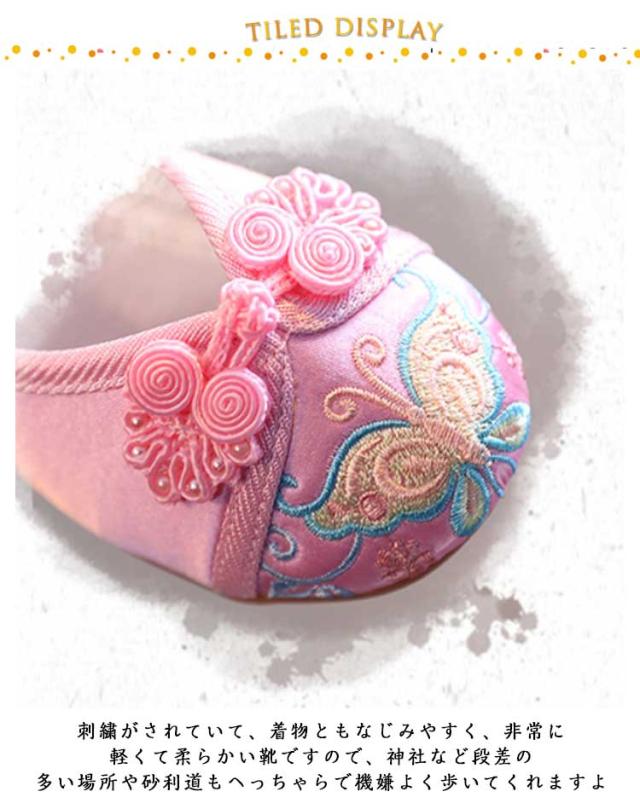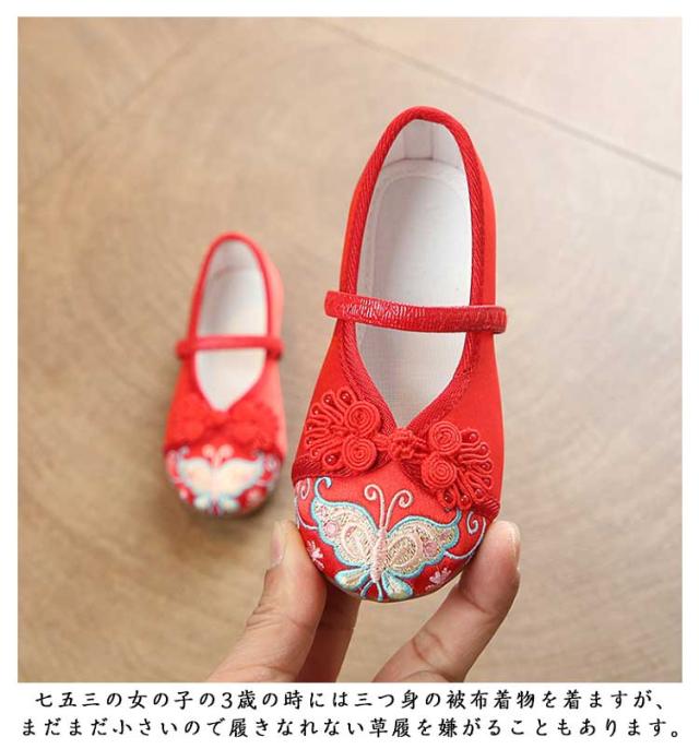 | 七五三の女の子の3歳の時には三つ身の被布着物を着ますが、まだまだ小さいので履きなれない草履を嫌がることもあります。 実際に足袋を履いて、草履を履かせてお出かけすると滑って脱げたり、躓いたり。草履で上手に歩くのはまだちょっと難しいよね、というのが本当のところです。 刺繍がされていて、着物ともなじみやすく、非常に軽くて柔らかい靴ですので、神社など段差の多い場所や砂利道もへっちゃらで機嫌よく歩いてくれますよ。 七五三が終われば、飾りを取って普段の靴として履いても可愛いです。 | |
