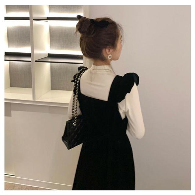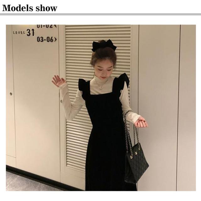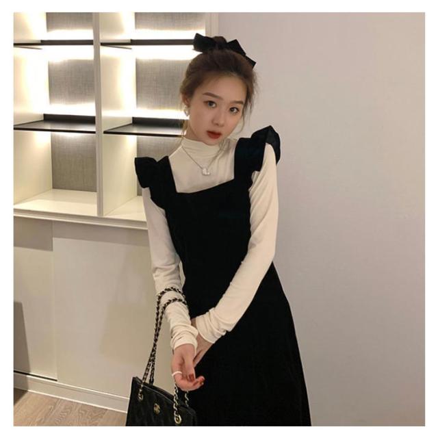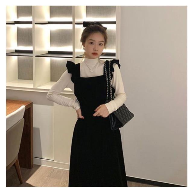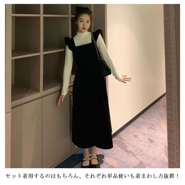 肩フリル 秋服 ジャンパースカート×カットソー ワンピース レディース セットアップ ジャンパー サロペット 2点セット 20代 ハイネック 肩フリル 秋冬 ベロア ジャンスカ 30代 ロングワンピース マキシ丈 長袖トップス