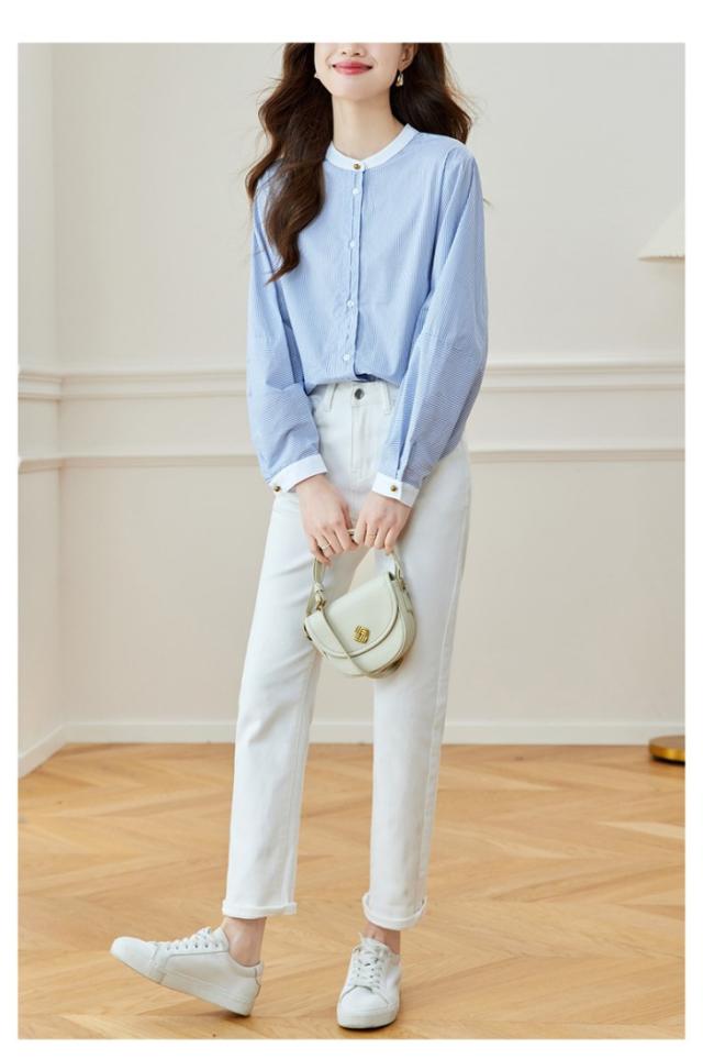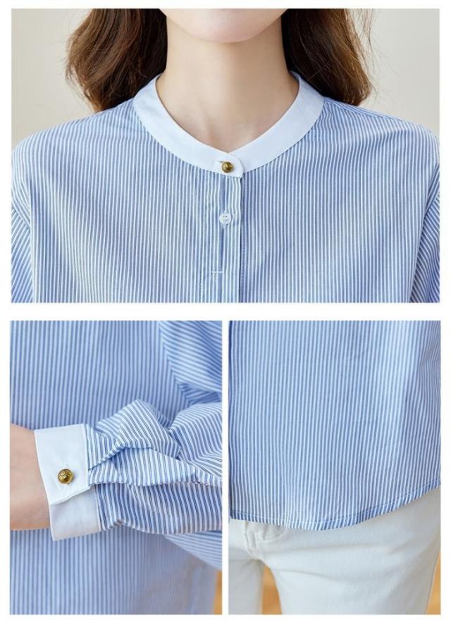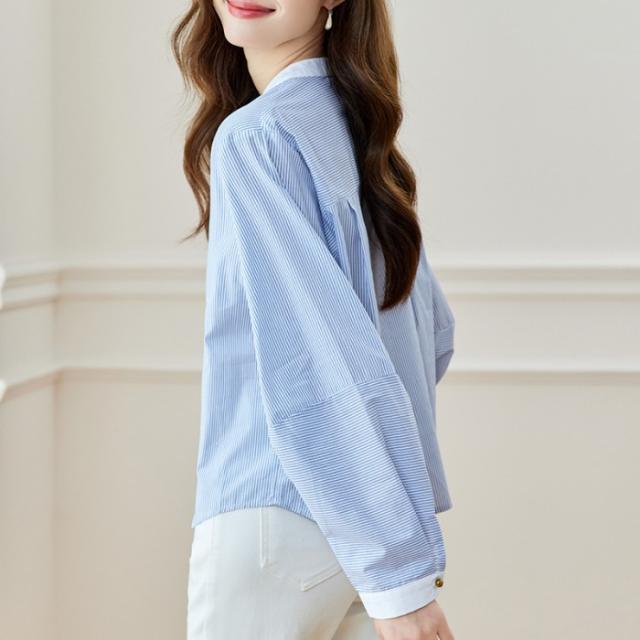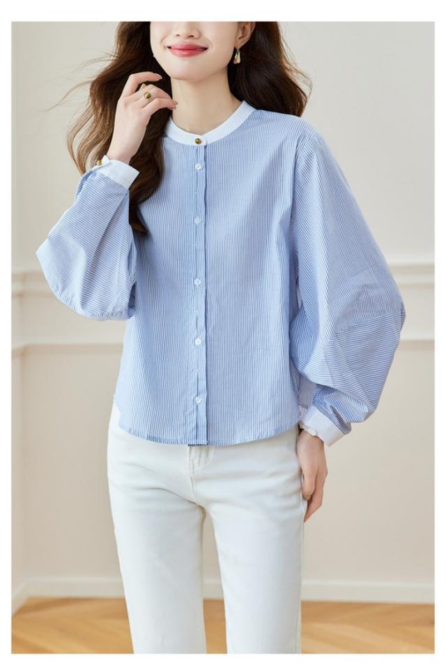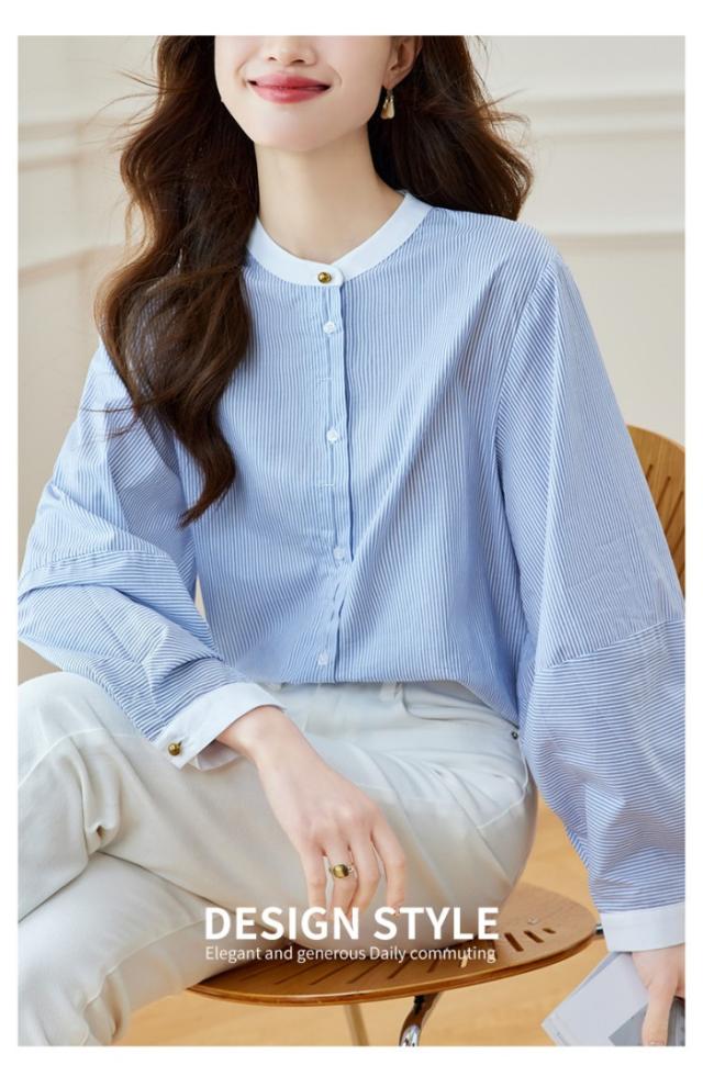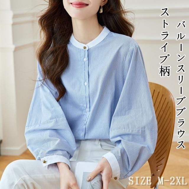トップス レディース ストライプ バルーンスリーブ ブラウス 綿100 バンドカラー 30代 40代 50代 秋 長袖 春服 オフィス カジュアル ママコーデ きれいめ フェミニン