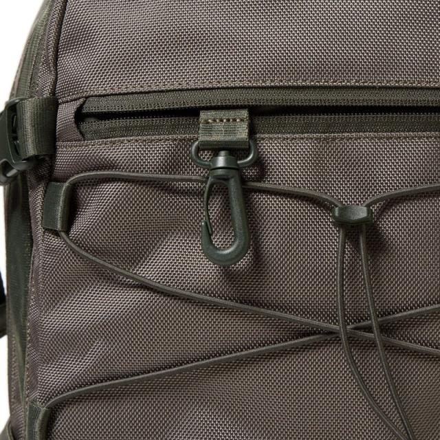 フロントに配されたバンジーコードは、上着やタオルなどを挟んで持ち運べるだけでなく、スタイリングのアクセントにもなります。