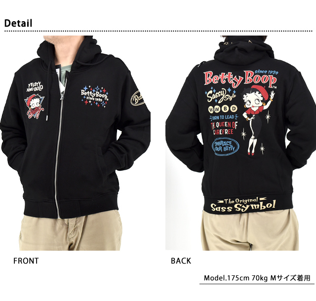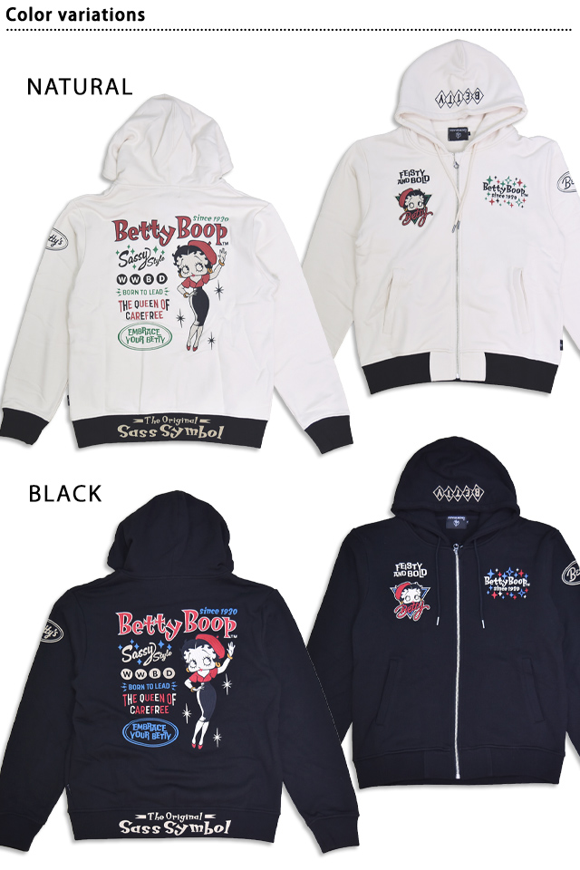 BETTY×ネバーマインド 裏毛スウェットジップパーカー(BBN-2519)のご紹介です。 大きな瞳とぽってりした赤い唇が印象的な女の子、ベティ・ブープ(Betty Boop)。 今回は、ベレー帽がキュートなスタイルに身を包んだベティを背中に刺繍しました。 モノトーンのボディに落とし込まれたカラフルなロゴがアクセントになっています。 フード、右袖、裾にはロゴをプリントしました。 ボディーには、裏毛タイプのスウェット生地を採用。 フロントはジップアップ仕様で、両身頃にはポケットが縫い付けられています。 袖口、裾にはリブを配置しました。 カジュアルに着こなしに取り入れることの出来る、大人のキャラクターアイテムです。 | |||||||||||||||||||||||||