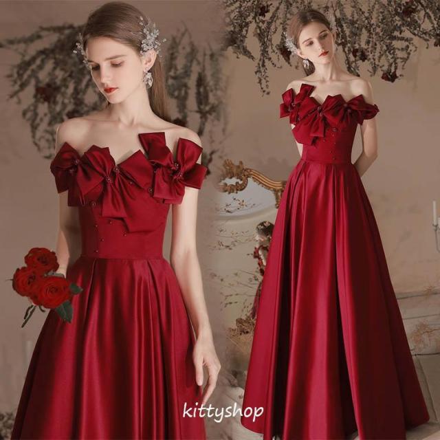 【大特価】イブニングドレス ワイン赤 オフショルダー サテン ドレス 結婚式ドレス 二次会ドレス ゲストドレス 発表会ドレス 演奏会ドレス ロングドレス