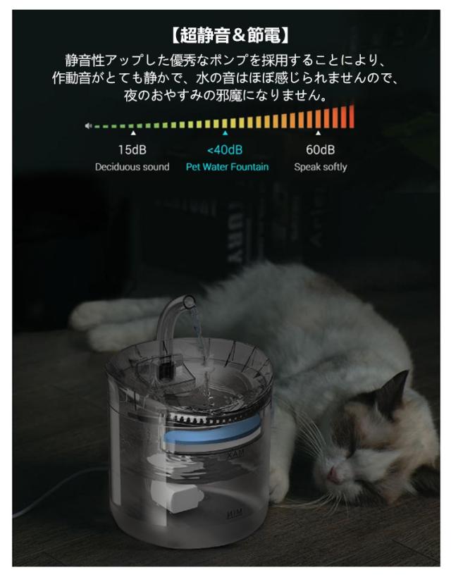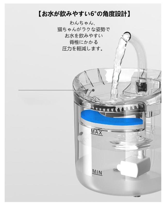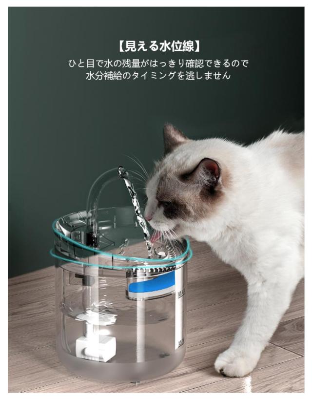 | 毎日きれいな水飲み器 交換用フィルター5個入 2L大容量 静音設計 USB式 2つの給水方式 飲みやすい6°の角度設計 <お勧めポイント> ●蛇口式:いつでもきれいでおいしいお水が飲めます ●4層ろ過:循環式で新鮮・きれいなお水 ●安全性:わんちゃん、猫ちゃんがかじっても感電しません ●2つの給水方式:お好みで選べる2つの給水方式 ●静音設計:騒音レベル40dB 【環境に優しい素材】 食品級ABS樹脂素材でペットはもちろん、人間が舐めても無毒で異臭なし、構造がシンプルで組立や取り外しも簡単にできます。水が留まった状態が長く続くと早く水のいたみが起こりやすくなる為、流水(動いている水)を作り出すことにより、ペットはいつでも新鮮な流れる水が飲めます。 【お好みで選べる2つの給水モード】 蛇口モード+湧き水モード 流れるお水に興味津々! お水を飲むのが好きになる 【お水が飲みやすい6°の角度設計】 わんちゃん、猫ちゃんがラクな姿勢でお水を飲みやすい 脊椎にかかる圧力を軽減します。 【超静音&節電】 静音性アップした優秀なポンプを採用することにより、作動音がとても静かで、水の音はほぼ感じられませんので、夜のおやすみの邪魔になりません。超静音と振動低減設計の最新の次世代水中ポンプ採用で、作業中で作動音の音がほとんど聞こえません。(水が少なくなると水の落ちる音は出ます) 【見える水位線】 ひと目で水の残量がはっきり確認できるので水分補給のタイミングを逃しません 【4層活性炭ろ過フィルター】 フィルターは水道水を常に軟水化し、皮毛、食べ残し、ほこりを取り除きながら循環しています。活性炭フィルターが常に水をろ過してくれます。 ※ご確認ください フィルターの使い始めなどはフィルターの一部が黄色い色になる場合があります、これはイオン交換樹脂の成分が溶出するためであり品質やペットには無害です。 ※貯水タンクは週に1度、ポンプは2週間に1度水洗いしてください ○コンセントの無い場所でも付属のUSBケーブルでに接続し使用できます。 コンセントに直接挿してのご使用もできます。 ※コンセントアダプターは付属しておりません。 【使用上の注意】 給水器の水漏れを防ぐ為、フィルターの使い始めはしっかり水通しをして水に馴染ませてからお使い下さい。その際に活性炭の黒い粉のような物が | |