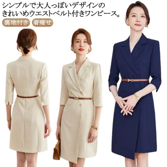 ワンピース レディース スーツ襟 オフィス ワンピーススーツ ミディアム丈 洗えるスーツ ベルト付き Vネック 白 紺 ドレス ウエストベルト付き 七分袖 膝丈 裏地付き 通勤 OL ビジネス 結婚式 七分袖 着痩せ フォーマル ママ 入学式 卒業式 カジュアル