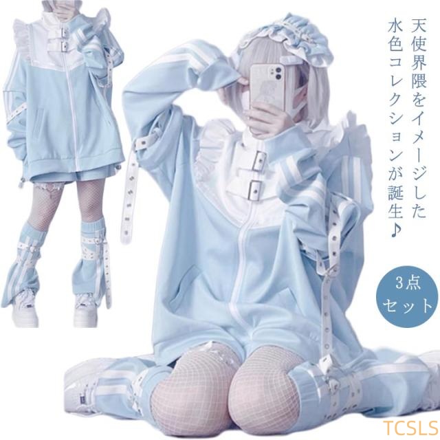 水色 地雷系 サブカル ジャージ 3点セット フリルジャケット ブルゾン ハーフパンツ レッグウォーマー 長袖 原宿系 ファッション 上下セット 地雷系 服 サブカル地雷 天使界隈 天使 水色界隈 レディース メンズ 送料無料