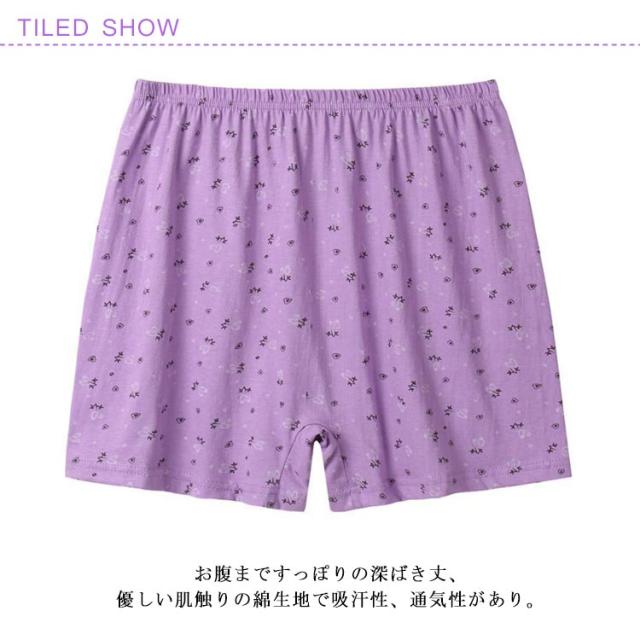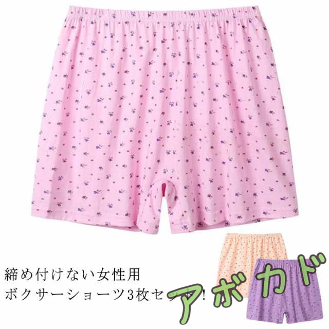 | 締め付けない女性用ボクサーショーツ3枚セット! お腹まですっぽりの深ばき丈、優しい肌触りの綿生地で吸汗性、通気性があり。 ウエストはゴムでお腹を締めつけにくく、裾広がりで履きやすく、脱ぎやすい。 かわいい花柄です。 | |