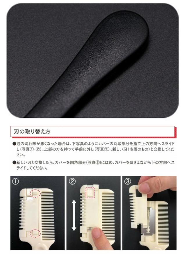 | サイズについての説明 | 使用方法 1.コームでとかします 2.髪をひと束、わけとります 3.指でつまみながらカットします 4. 2と3を続けてお好みの長さに 刃の取り替え方 刃の切れ味が悪くなった場合は、 下写真のようにカバーの丸印部分を指で上の方向へスライド(写真1・2)、上部の方を持って手前に外し(写真3)、新しい刃(市販のもの)と交換してください。 新しい刃と交換したら、 カバーを四角部分(写真2)にはめ、カバーをおさえながら下の方向へスライドしてください。 |