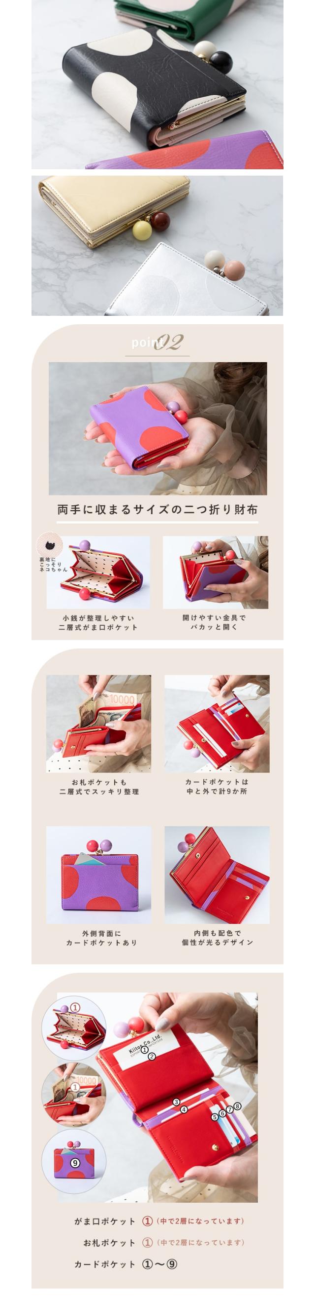 お札入れとがま口の小銭入れは中で2つに仕切られていて、カードポケットも計9か所と充実。