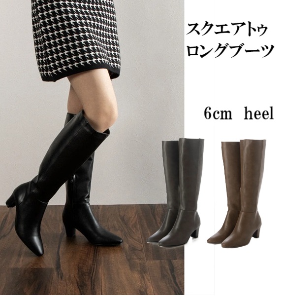 スクエアトゥロングブーツ ローヒール ニーハイ 定番 ロングブーツ ふくらはぎがやや太め ストレスフリー 歩きやすい おしゃれ ブラック グレー 大きいサイズ 小さいサイズ 安定感