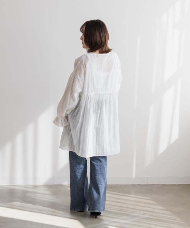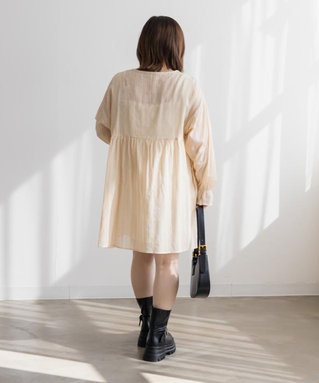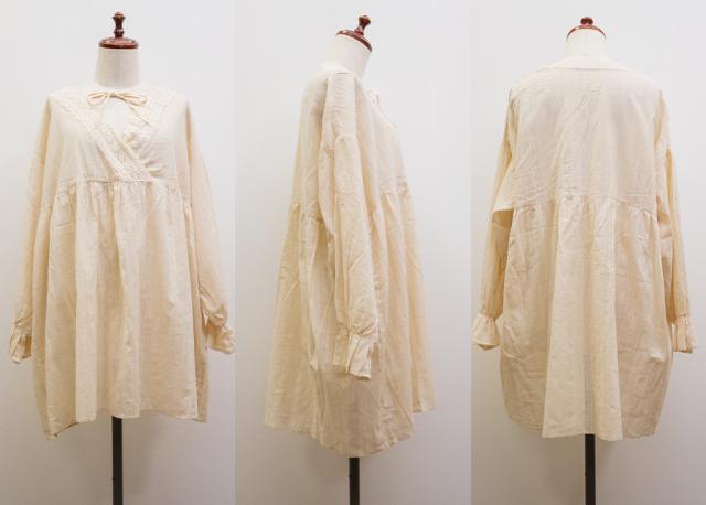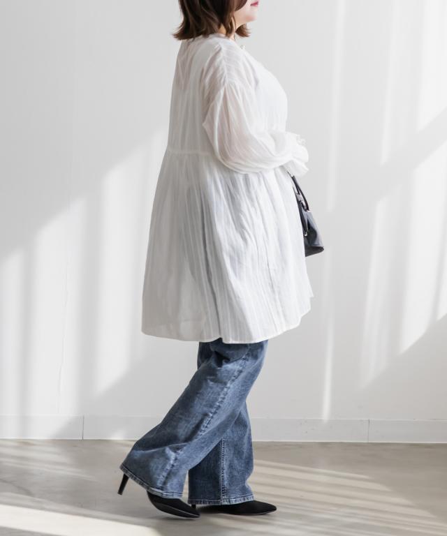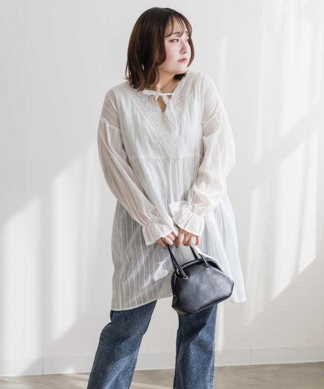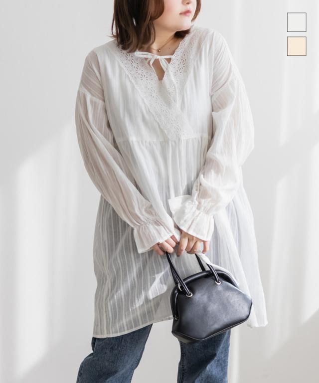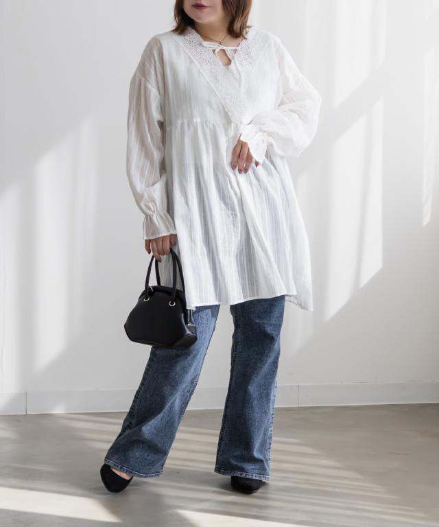 | 3Lサイズを着用しました。着用感はちょうどいいです。カシュクールデザインがデコルテをきれいに見せてくれ、フェミニンな印象を引き立てる1枚です◎胸下に切替があって自然にメリハリをプラスしてスタイルアップが叶います。ウエストはゴムなど入っていない仕様なので、ストンとしたシルエット感もかわいいです。軽やかなレース素材は透け感があり秋っぽさもありながら涼しいのが嬉しい。長めのチュニック丈がヒップまわりをカバーしてくれるので、スキニーパンツやレギンスとの相性も抜群です。デニムでカジュアルに、スラックスで大人きれいめにと幅広いコーディネートが楽しめます。 |