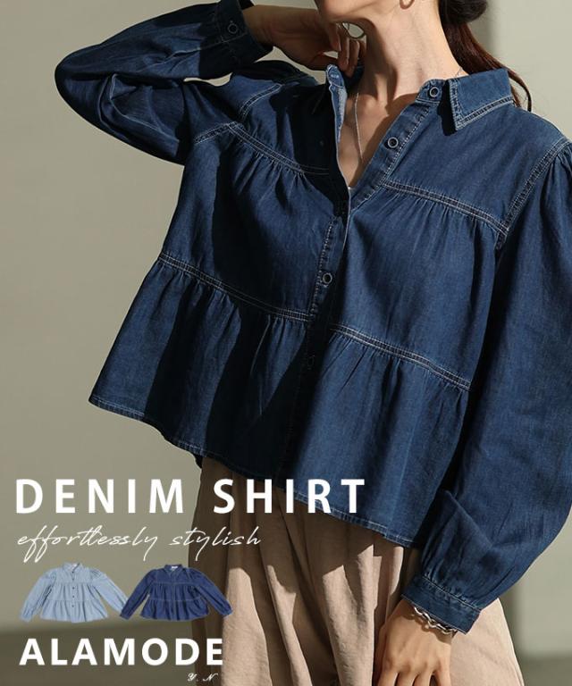 春新作 一枚で主役級なビスチェ風シャーリングダンガリーシャツ レディース ファッション トップス シャツ ブラウス デニム ダンガリー 長袖 シャーリング 無地 30代 40代 50代 60代 サワアラモード sawaalamode otona 大人 cawaii 可愛い 洋服 かわいい服 aljun-1008s