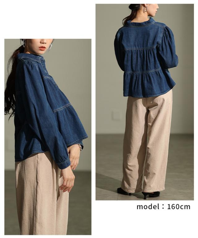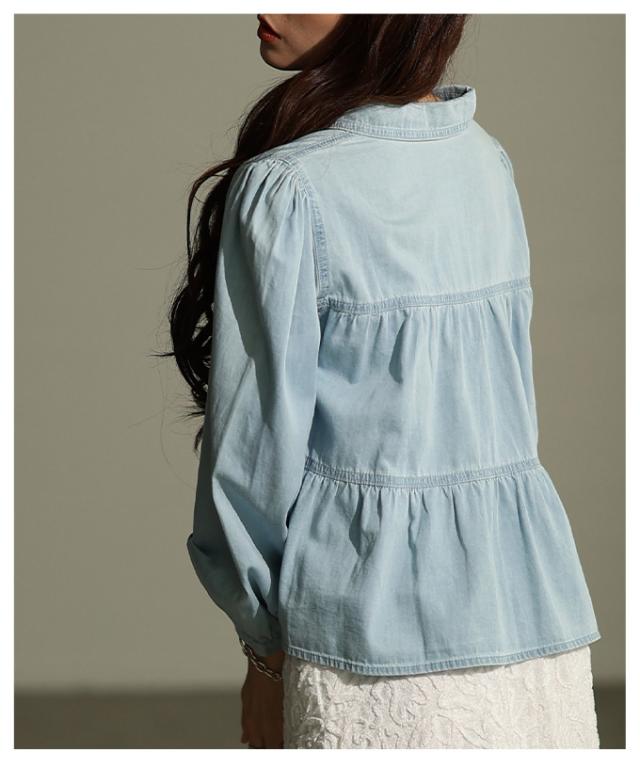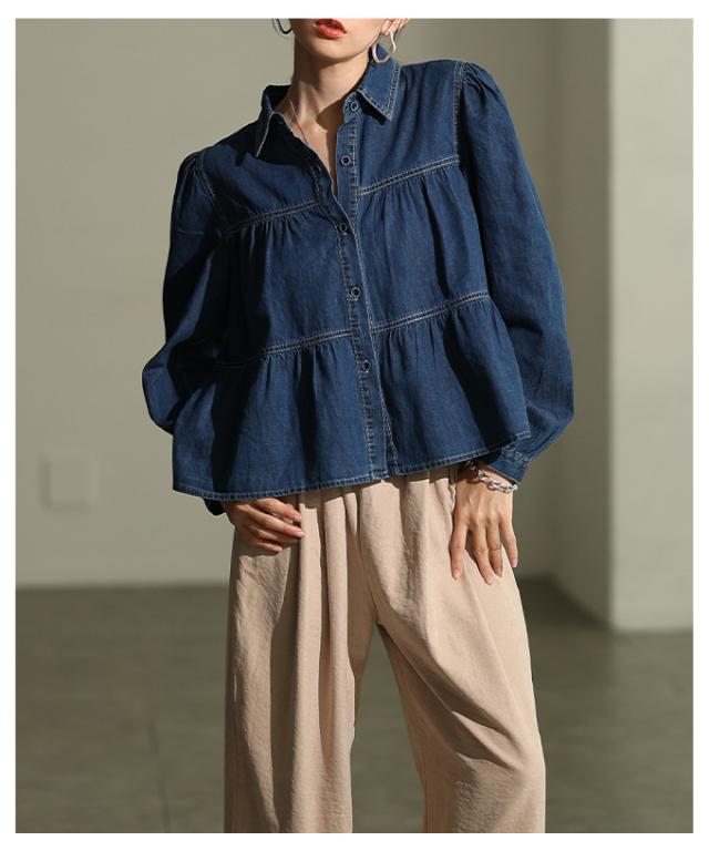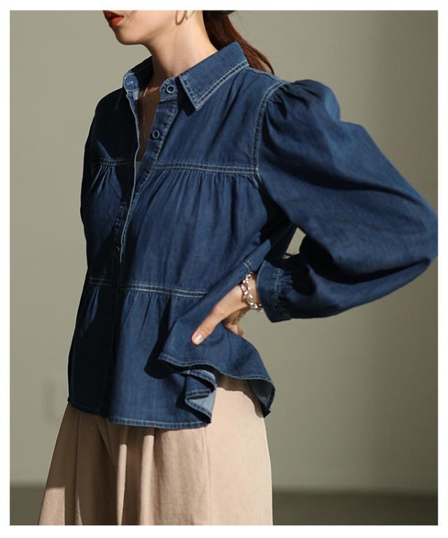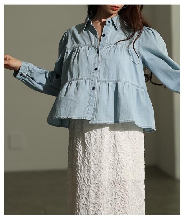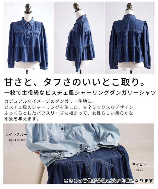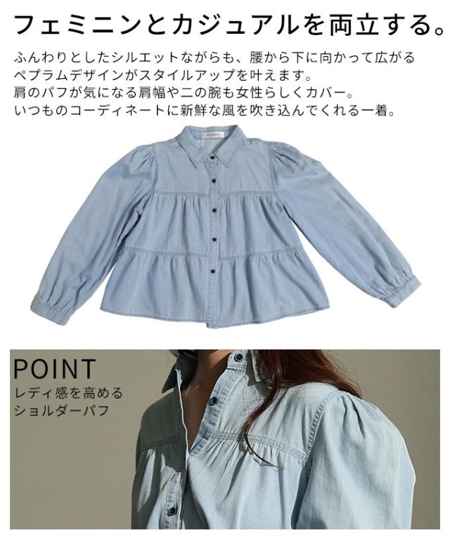 特徴: シャーリング ティアード フレア ダンガリー デニム ボタン パフ レギュラーカラー カフス