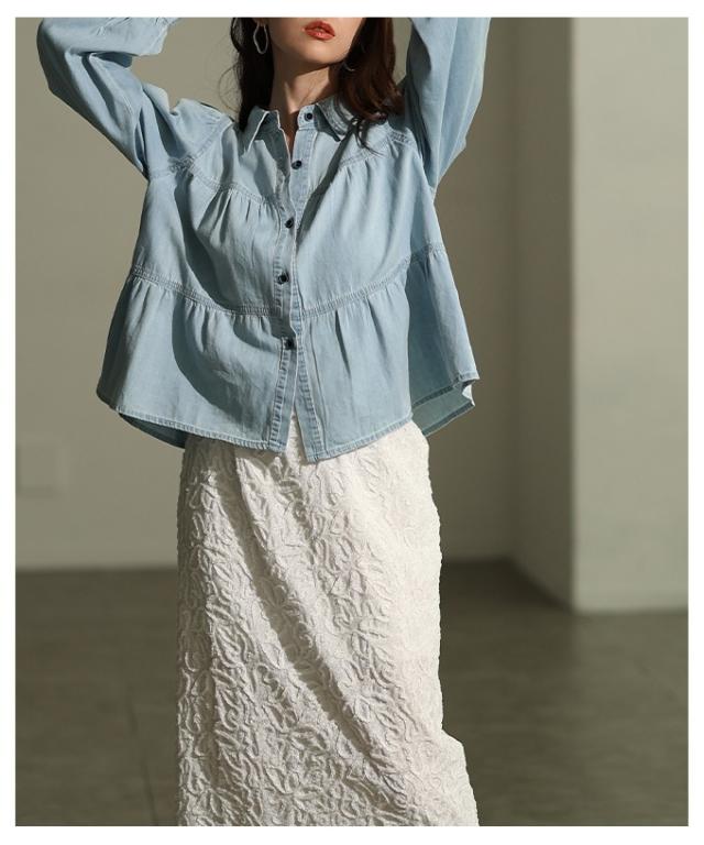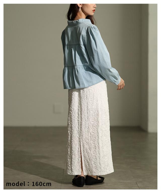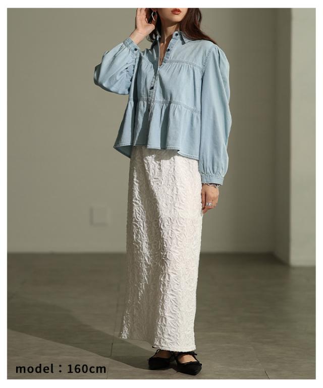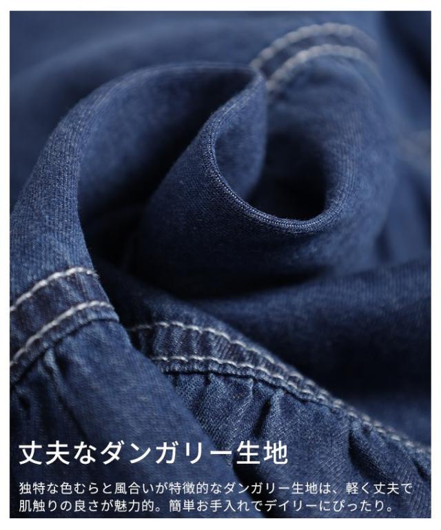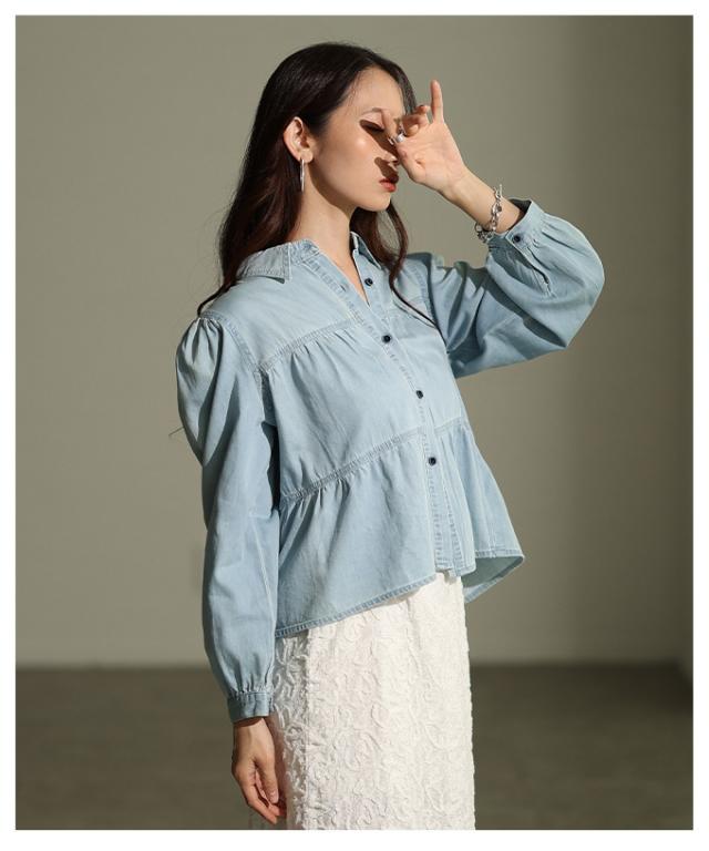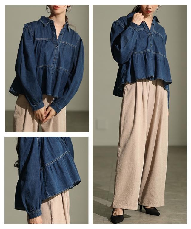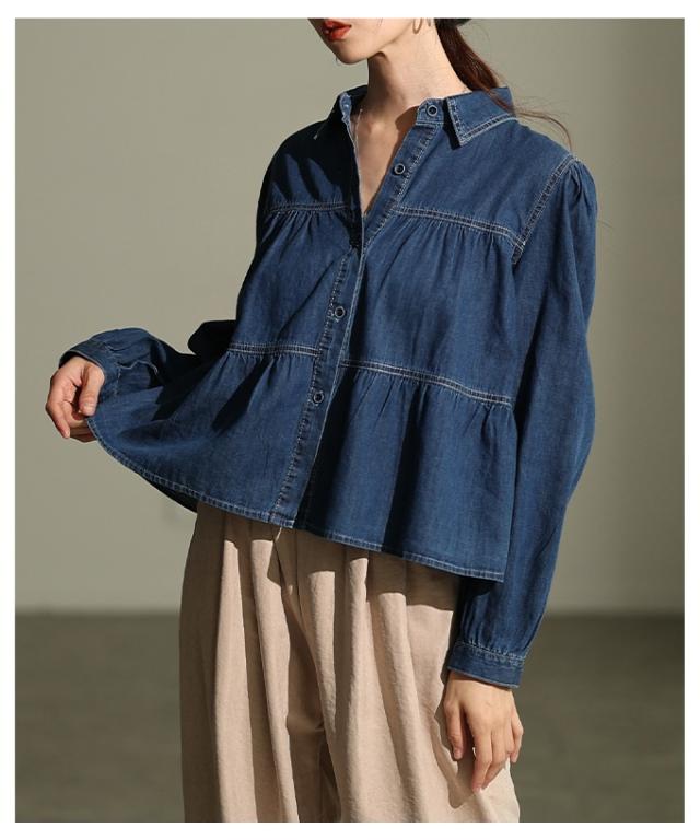 特徴: シャーリング ティアード フレア ダンガリー デニム ボタン パフ レギュラーカラー カフス
