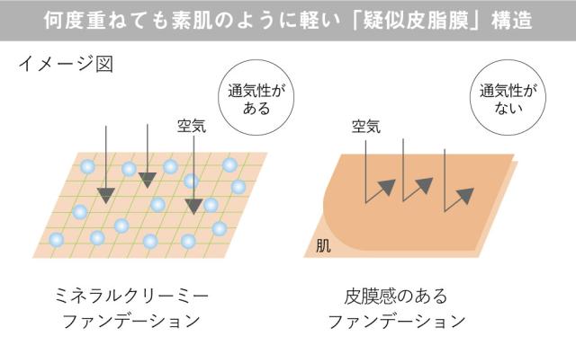 | Point 03 新感覚のつるっとした「疑似皮脂膜」仕上げで、カバー力も自在にツヤ肌に 肌なじみのよい野菜油*4により、軽やかな付け心地でありながら、高いカバー力を発揮。さらにプロポリスエキスが、よりつるんとなめらかに、美しい仕上がりを持続させます。