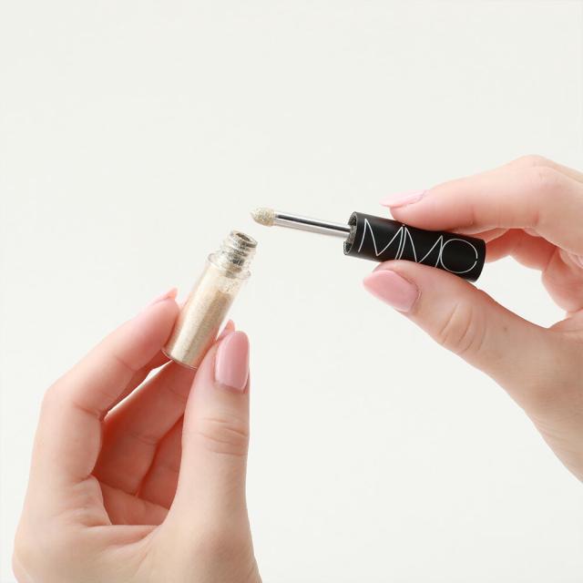 キャップをしめたまま、トントンと、手のひらや机の上などに容器を打ち付けるようにしていただき、余分についたパウダーを落としてください。 肌がツヤめく、MiMCのポイントメイク