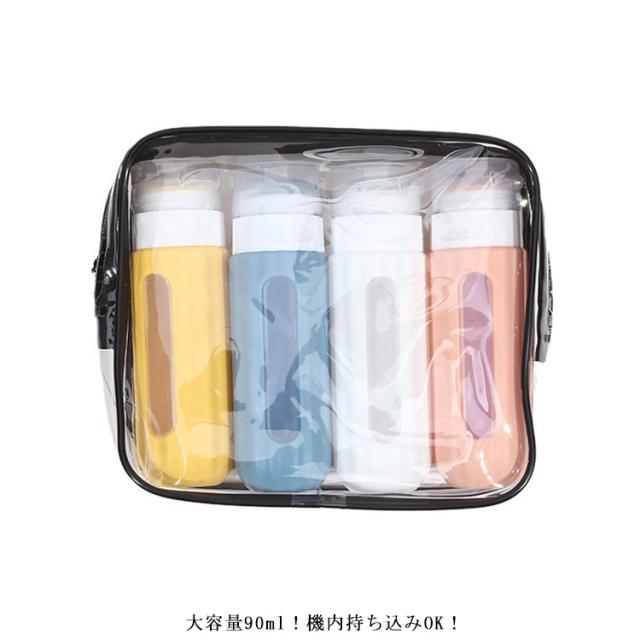 | 詰め替えボトル4個セット。 クリアケース付き!残量が見えるスリット付き! 大容量90ml!機内持ち込みOK! 注ぎ口が広くて補充しやすい。 | |