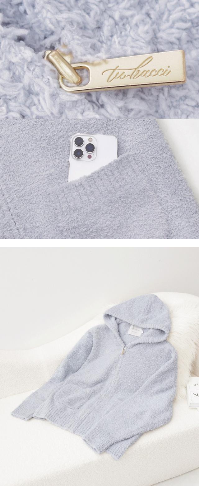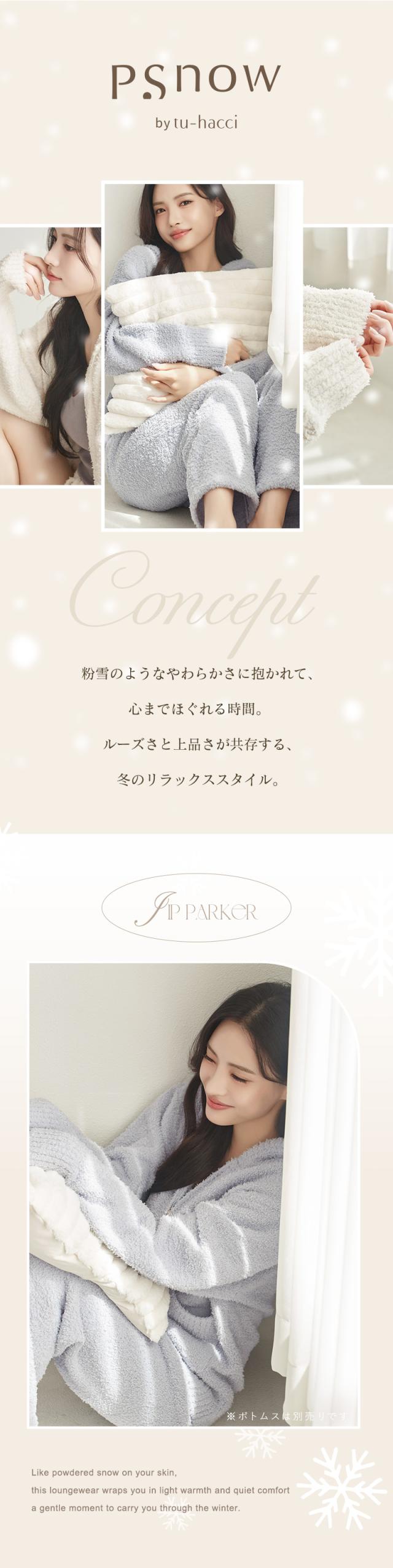 tu-hacci Roomwear Collection ジップパーカー単品 粉雪のように、軽やかで優しい肌ざわり。 ≪P.snowシリーズ≫ 抜け感でつくる、大人のニュアンスフェミニン。 柔らかなぬくもりに抱かれて心までほぐれる時間。 ルーズさと上品さが共存する、冬のリラックススタイル。 【こんな方におすすめ】 ・くつろぎながらも、洗練された雰囲気を楽しみたい方 ・なめらかな肌ざわりにこだわりたい方 ・軽やかな着心地がお好きな方 ・自然に体型カバーできるルームウェアを探している方 ■保温性+肌ざわりにこだわったリラックスウェア ・繊維の間に空気を含み、温かさを逃がさない ・毛羽落ち、毛玉になりにくい素材を使用 ・粉雪のように柔らかな質感で快適な着心地 ・シワになりにくく、型崩れしにくい ■可愛くなりすぎない、大人のジップパーカー ・程よい落ち感でカジュアルになりすぎない ・フードで首元まで暖かい ・腰まわりを自然にカバー ・ゴールドのオリジナルファスナーでフェミニンさをプラス 両腰には便利なポケット付きで、機能性も◎ ロゴ刺繍がさりげないアクセントに。 ≫ ギフトラッピングはこちら ≪ |