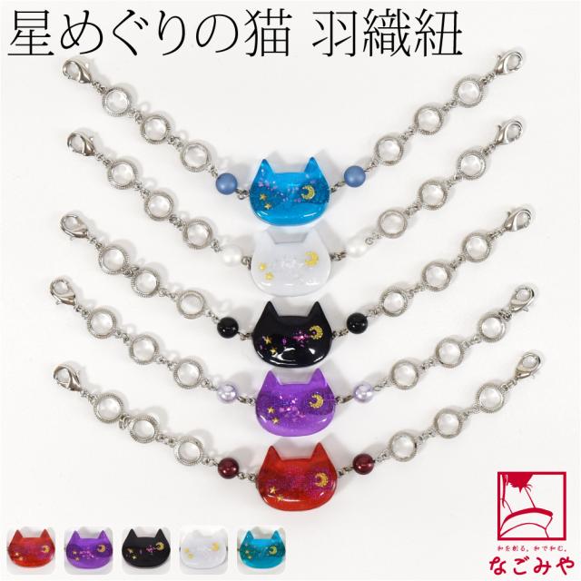 ぷっくり可愛い猫の銀河にキラキラ星や月が輝く、ドリーミーな羽織紐。
