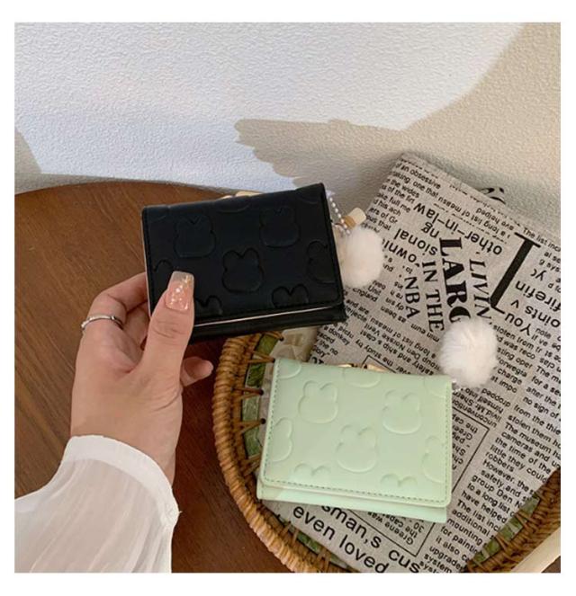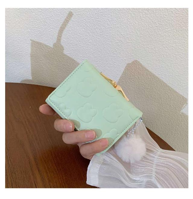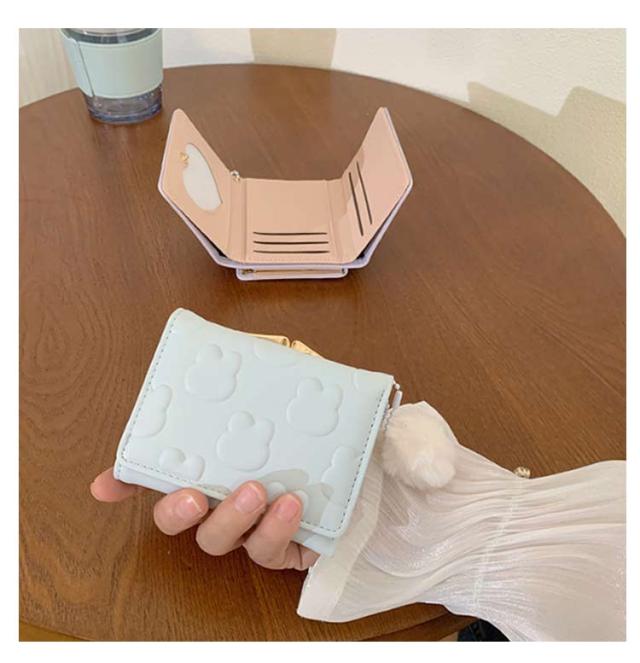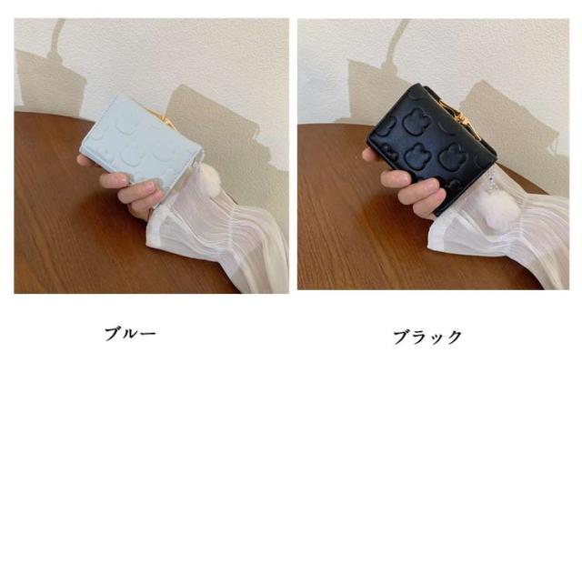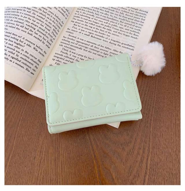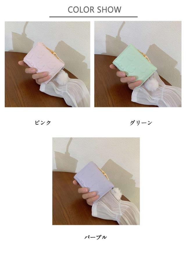 | 【がま口財布】 【3つ折り】 ・かわいいウサギの型押しされた、コンパクトな三つ折り財布です。片手の手のひらに収まる持ちやすい大きさで、お子様にも扱いやすいサイズです。 ・ボタンをはずして中を開けると、カード入れ5か所、フリーポケット2か所、パス入れ1か所、札入れ1か所、そしてがま口の小銭入れが1か所です。がま口の中に仕切りはなく、中の小銭が取り出しやすくなっています。 ・ウサギのしっぽのような丸いモフモフのチャームがポイント!パステルカラーの色味とマッチして可愛さ満点。 ・優しいパステルカラーとアイコンのようなウサギ模様がとってもキュート。ママさんやOLさんからキッズやジュニアにも幅広い年齢層にお使いいただけます。プレゼントにすると大変喜んでいただけることでしょう。 | |