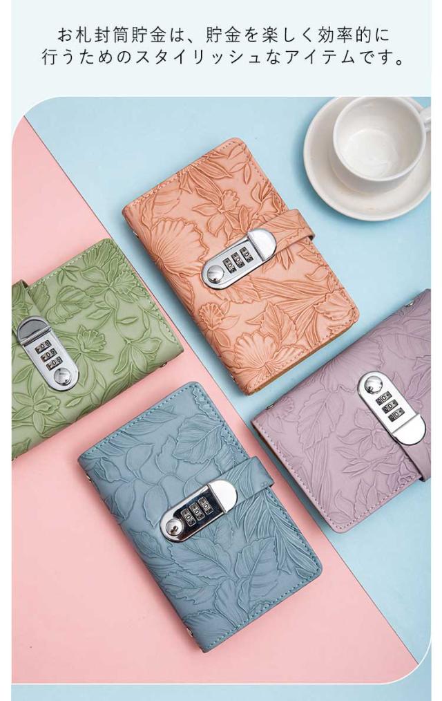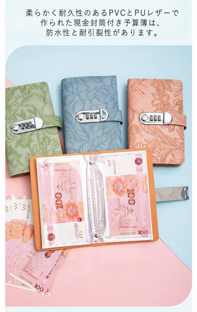 | 花柄スタイルが施されたデザインは、インテリアとしても魅力的です。 柔らかく耐久性のあるPVCとPUレザーで作られた現金封筒付き予算簿は、防水性と耐引裂性があります。 お札封筒貯金は、貯金を楽しく効率的に行うためのスタイリッシュなアイテムです。 パスワードロック付きで,ファイル、請求書、現金など、あらゆるものを安全に保管します。 ダイヤルロック付きで、最大100枚のお札を安全に収納可能。 お札を折らずに収納できるため、きれいに保管できます。 現金の仕分けや節約に最適なこのバインダーは、貯蓄をサポートし、日々の管理を簡単にします。 おしゃれな封筒貯金で、貯金生活をより充実させましょう。 | |