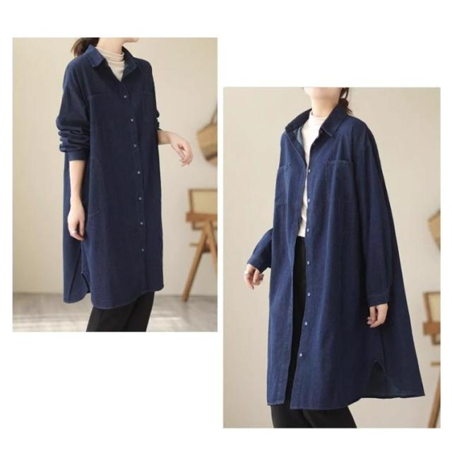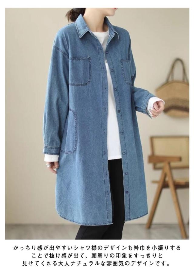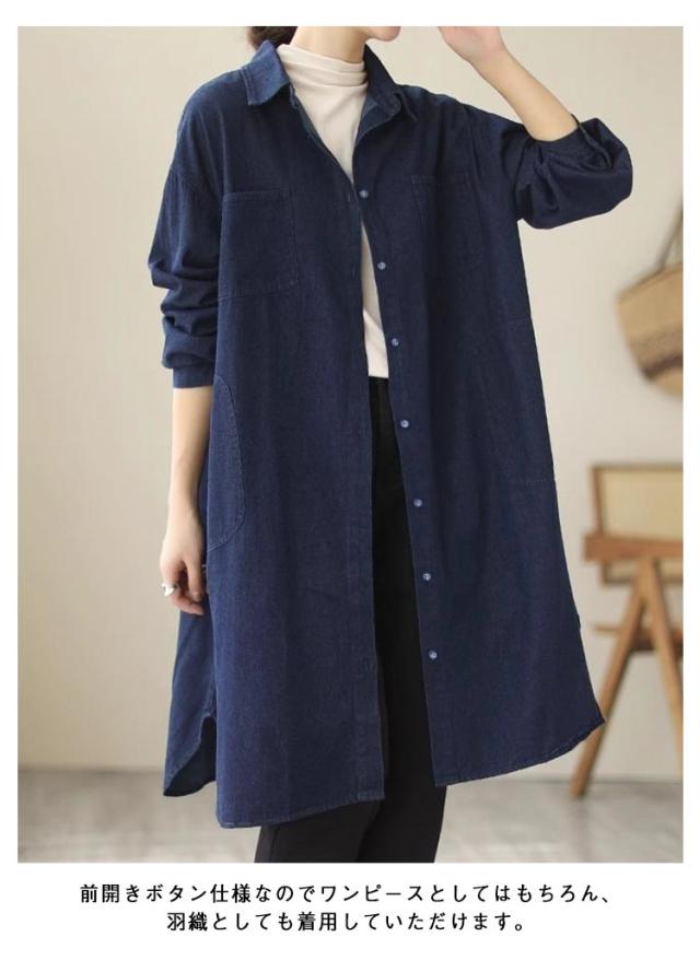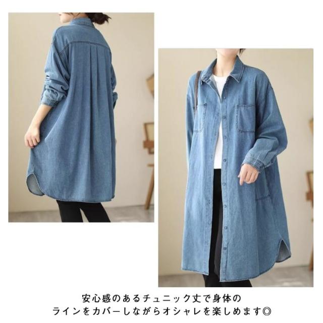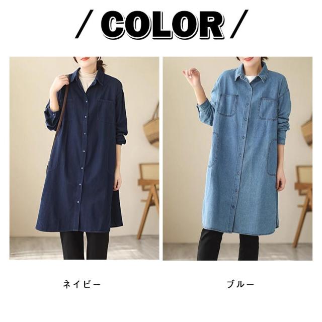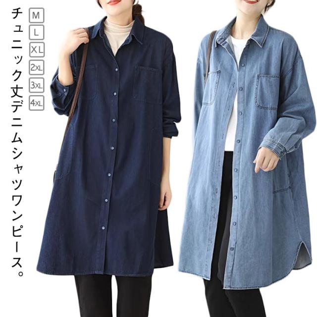 シャツワンピース 長袖 チュニック丈 デニム レディース 春 ワンピース ゆったり 体型カバー 襟付き チュニックワンピース デニムワンピース デニムワンピース 秋 30代 きれいめ 冬 40代 50代 デニムシャツ ロングシャツ お尻カバー 大人 カジュアル 韓国風