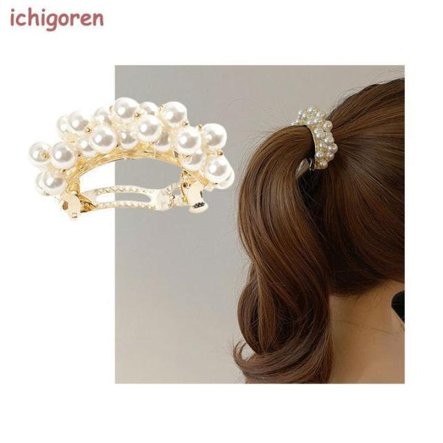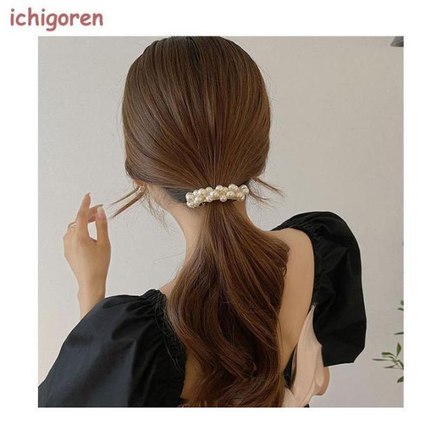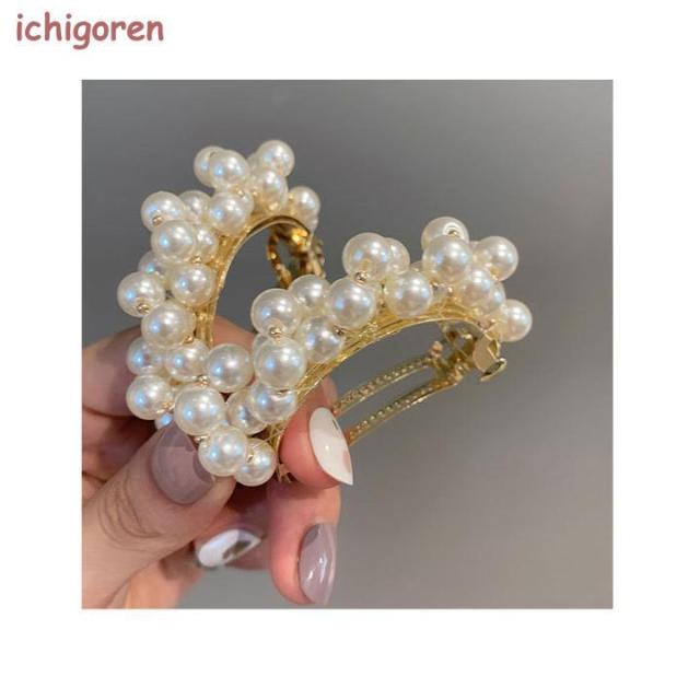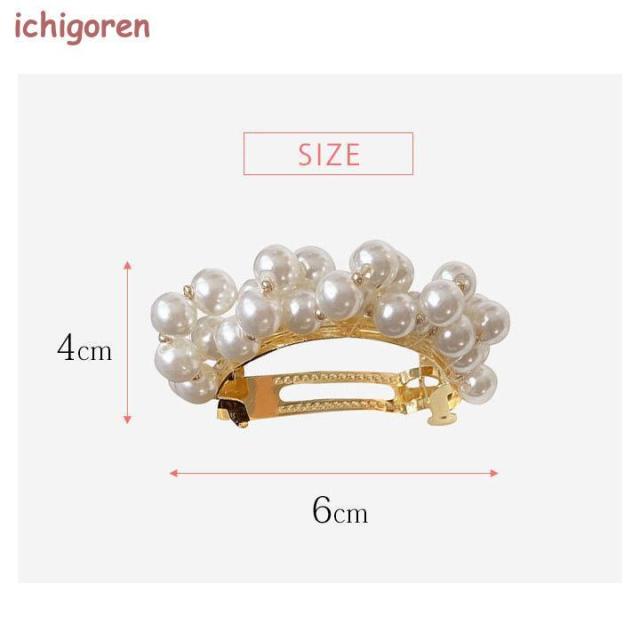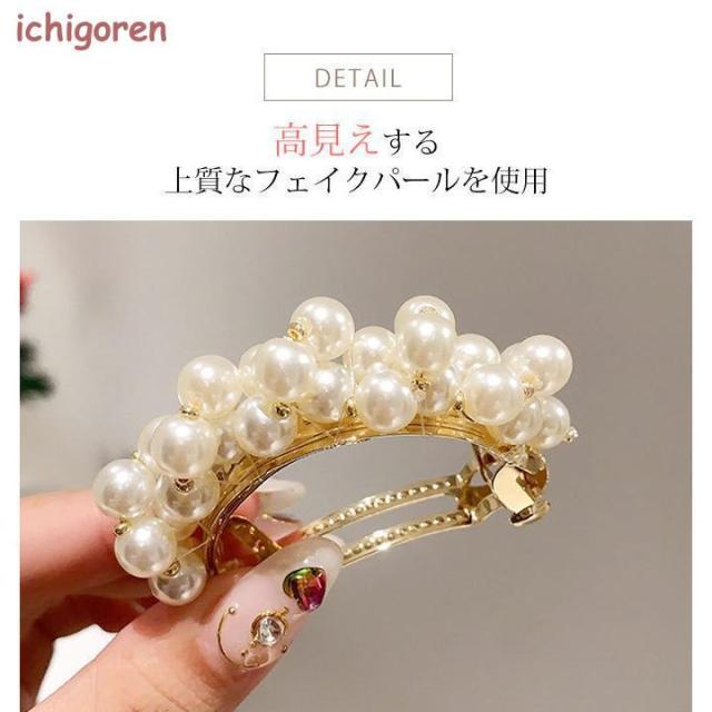 フェイクパールが上品で清楚なイメージの小さめバレッタです。