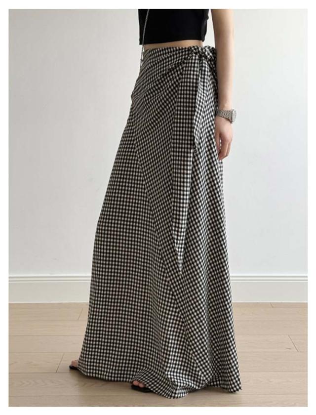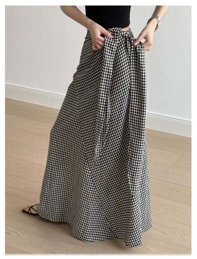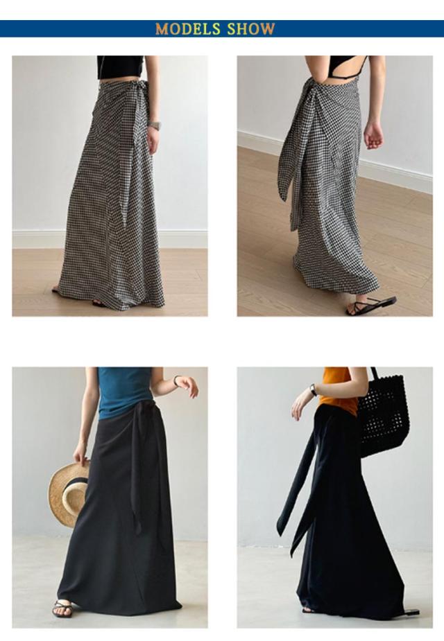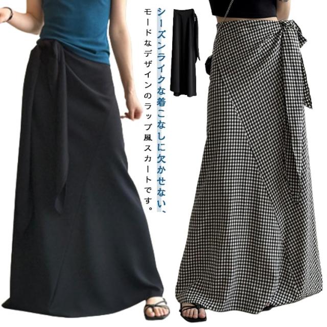 チェック柄 スカート シュクールスカート ウエストリボン ラップ風スカート 海 マキシスカート ラップスカート マキシ丈 ロング丈 タイトスカート マキシ Iラインスカート ロングスカート リゾート 旅行 無地ブラック 黒