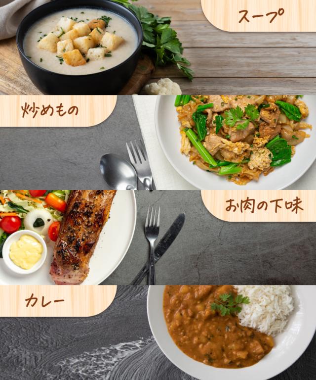 お肉の下味、コンソメスープ、炒めもの、カレーなどに一振りすると風味がひきたちます。
