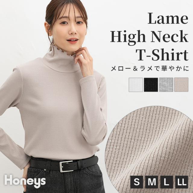 トップス Tシャツ ロンT 長袖Tシャツ カットソー 長袖 ハイネック ラメ糸入り ストレッチ テレコ素材 レディース SALE セール Honeys ハニーズ ラメハイネックTシャツ