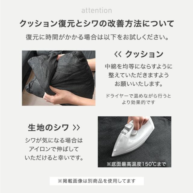 ・カバー:生地のシワがなかなか取れない場合は、低温(150℃まで)でアイロンをかける事で改善いたします。